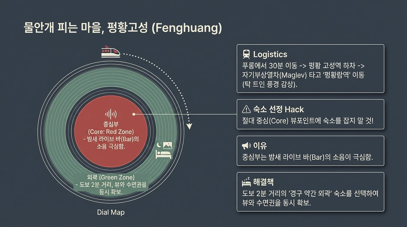 Q7. 봉황고성 숙소 선택 시 '경구(Scenic Area) 내부'보다 '외부'를 선호한 구체적인 이유는 무엇인가요? A: 봉황고성 경구 내부에는 밤늦게까지 라이브 음악을 연주하는 바(Bar)들이 많아 다소 시끄러울 수 있습니다. 휴식을 중요하게 생각한다면 경구에서 도보 2분 정도 거리의 약간 외곽에 숙소를 잡는 것이 깨끗하고 조용한 환경을 확보하는 데 유리합니다.