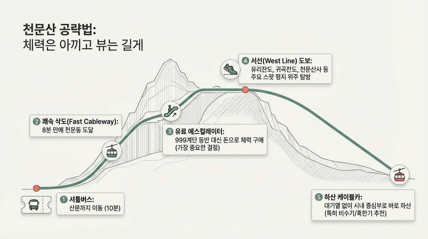 - 동선 설계: 천문동 투어 후 에스컬레이터(유료)를 이용해 산 정상에 도달한 뒤, 서선(West Line)의 귀곡잔도와 유리잔도를 관람하고 케이블카로 하산하는 동선이 가장 체력 소모가 적습니다.