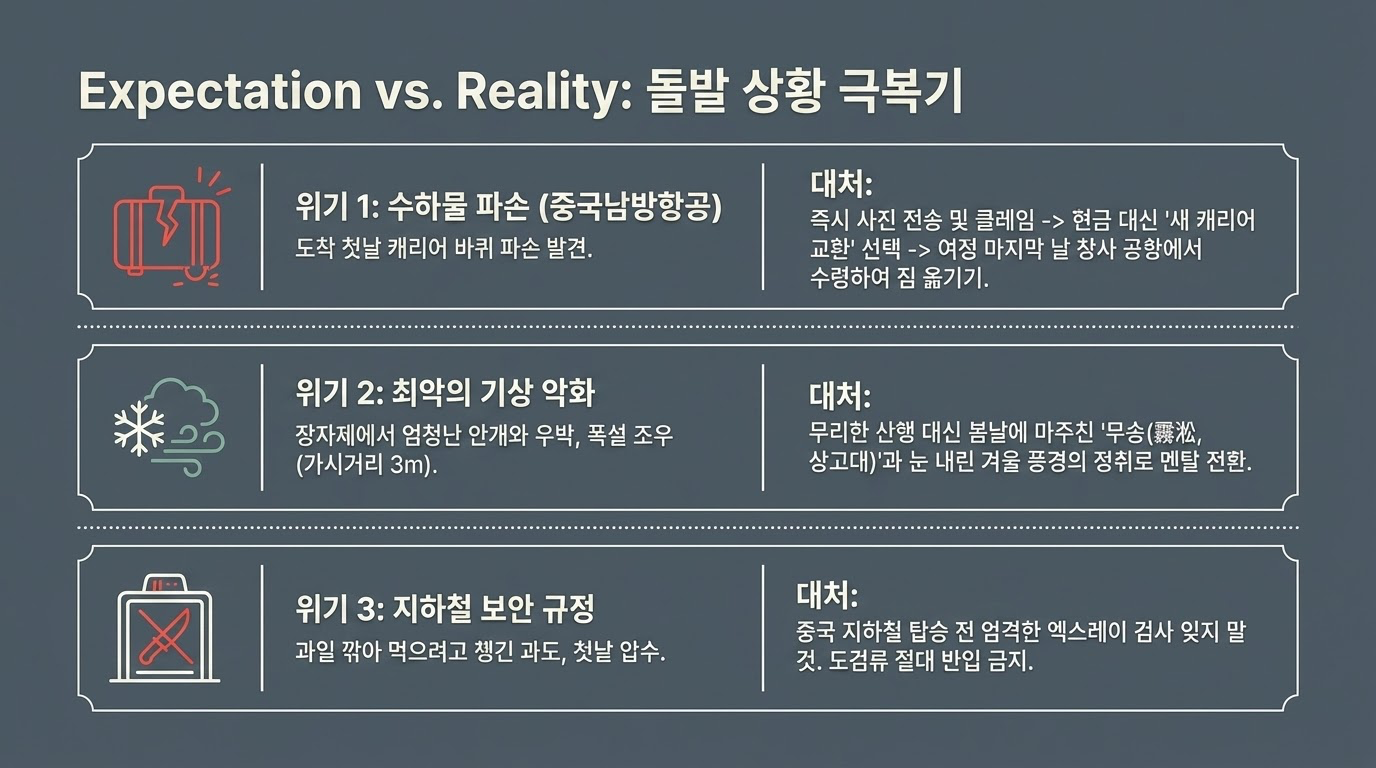 장가계의 기둥들이 구름 사이로 솟아오른 절경을 꿈꾸며 떠나는 길은 설레지만, 현실의 여행은 때로 가혹한 시험대를 제시합니다. 가시거리가 고작 3m에 불과해 거대한 산맥이 흰 공백 속으로 자취를 감추는가 하면, 철저한 보안 검색대에 애지중지하던 물건을 내어주어야 하는 순간도 찾아옵니다.