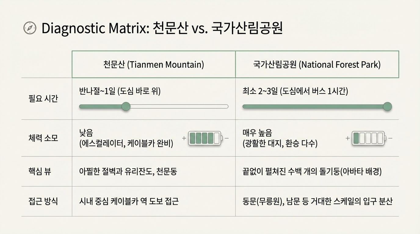 험준한 자연경관을 인간의 기술로 굴복시킨 중국의 관광 인프라는 여행자의 피로도를 혁신적으로 낮춰줍니다. 특히 장가계의 변덕스러운 기상 조건을 고려할 때, '시간의 예산'을 짜는 것은 돈을 아끼는 것만큼 중요합니다.
