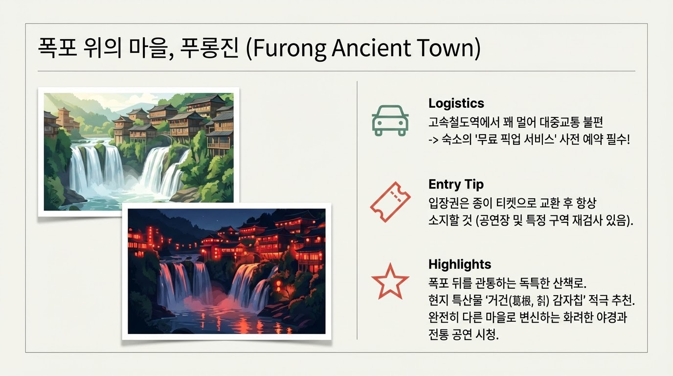- 부용진(Furong): 폭포 위에 세워진 이 기묘한 마을은 자연과 인간의 거주지가 어떻게 공존하는지 보여줍니다. 폭포 뒤편을 직접 걸어 통과하는 '수렴동' 같은 경험은 유니크함의 정점입니다. 이곳에 머문다면 현지 특산물인 **'미두부(쌀두부)'**와 씹을수록 고소한 **'갈근(칡) 감자칩'**을 반드시 맛보아야 합니다.