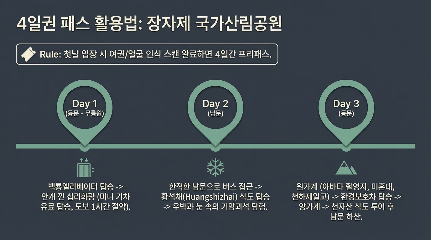 - 4일 유효권의 전략적 가치: 장가계 국가삼림공원의 입장권은 4일간 유효합니다. 이는 날씨 때문에 풍경을 놓친 여행자에게 주어지는 '패자부활전 티켓'입니다. 첫날 안개로 아바타의 배경지를 놓쳤더라도, 이틀 뒤 눈 덮인 설경으로 다시 만날 수 있는 여유는 이 4일권 시스템에서 나옵니다.