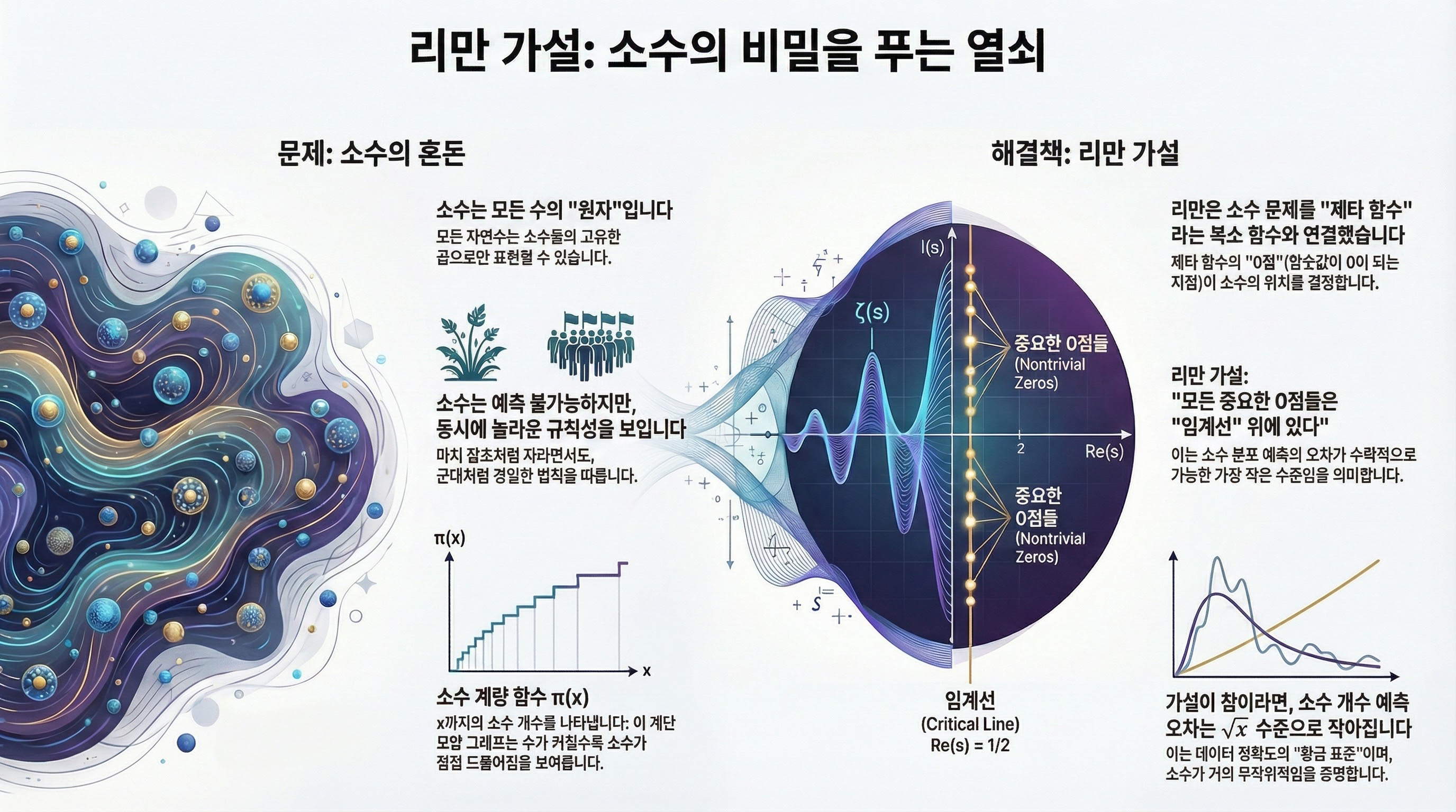 우리의 목적은 리만 가설이 도대체 무엇인지, 왜 그렇게 중요한지, 특히 소수 분포와 소수 간격 같은 개념들과 어떤 연관이 있는지 이해하도록 돕는 것입니다.