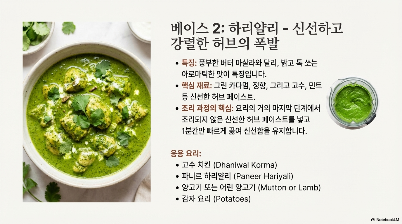 버터 마살라가 풍부하고 크리미한 위로의 맛을 선사한다면, 하리얄리는 '밝고, 톡 쏘며, 향기로운' 허브의 신선함이 폭발하는 베이스입니다. 이 베이스의 가장 큰 특징은 요리 마지막에 익히지 않은 신선한 녹색 허브 페이스트를 추가하는 것입니다. 이는 허브의 섬세하고 신선한 향이 열에 의해 날아가지 않도록 하여, 요리에 생생한 활기를 불어넣는 핵심 기술입니다. 하리얄리는 마지막 8단계에서 '신선한 허브 페이스트'를 더해 공식을 창의적으로 변형하며, 기본 원리의 응용 가능성을 보여주는 훌륭한 예시입니다.