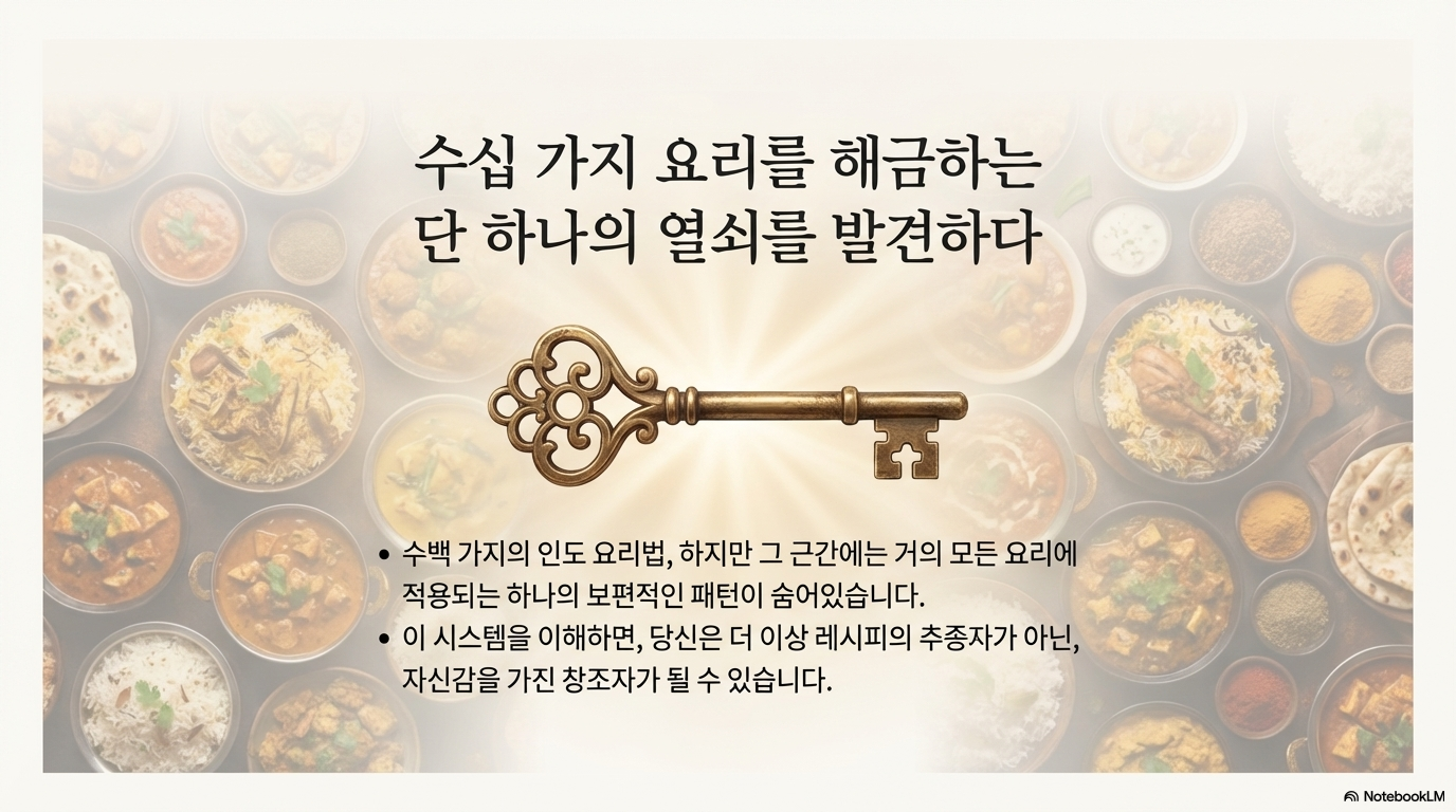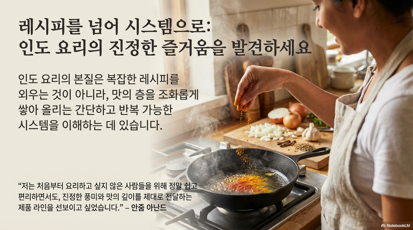 인도 요리는 향신료가 많고 과정이 복잡해서 전문가만 할 수 있다는 것은 흔한 오해입니다. 저명한 인도 요리 전문가 안줌 아난드(Anjum Anand)는 "인도 요리가 얼마나 쉬운지 보여주는 것"을 자신의 사명으로 삼는다고 말합니다. 인도 요리의 핵심은 수많은 레시피를 암기하는 것이 아니라, 요리의 기본이 되는 '시스템'을 이해하는 데 있습니다.