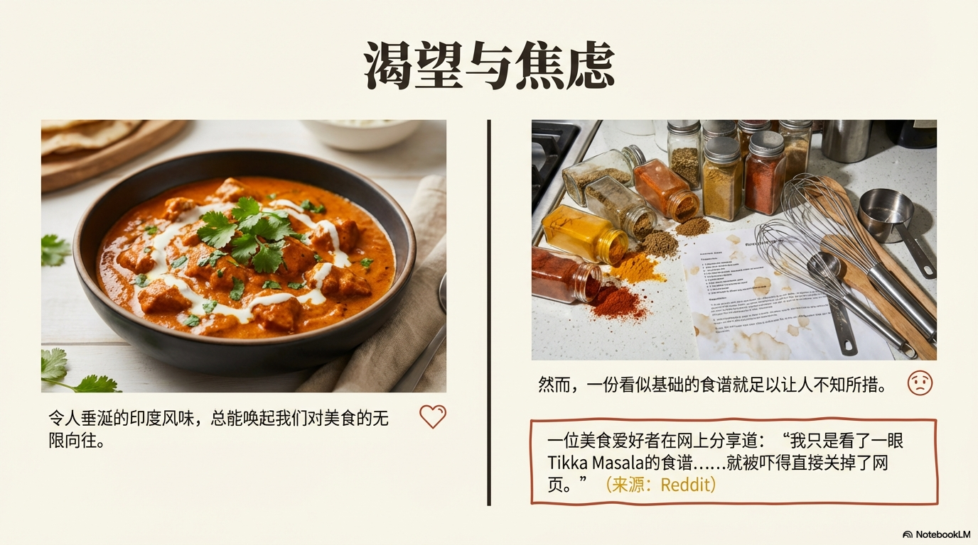 | 요리 초보 탐험가 | 새로운 요리(특히 인도 요리)에 도전하고 싶지만, 복잡한 레시피와 생소한 향신료 목록에 압도당하는 사람. | "인도 요리는 너무 어렵고 시간이 많이 걸릴 것 같다." | "Indian Food Made Easy"라는 메시지와 함께, 5가지 기본 향신료(커민, 고수 씨앗, 칠리 파우더, 강황, 가람 마살라)부터 시작하는 단계별 접근법을 제공하여 자신감을 심어줌. |