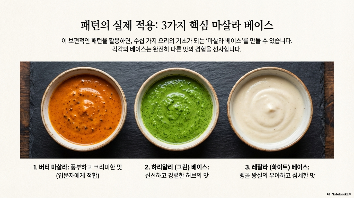 모든 인도 요리가 똑같은 맛을 내는 것은 아닙니다. 기본 공식 위에 어떤 재료를 쌓아 올리느냐에 따라 전혀 다른 맛과 경험이 탄생합니다. 로쉬니 더트가 소개한 세 가지 대표적인 마살라 베이스는 그 좋은 예입니다.