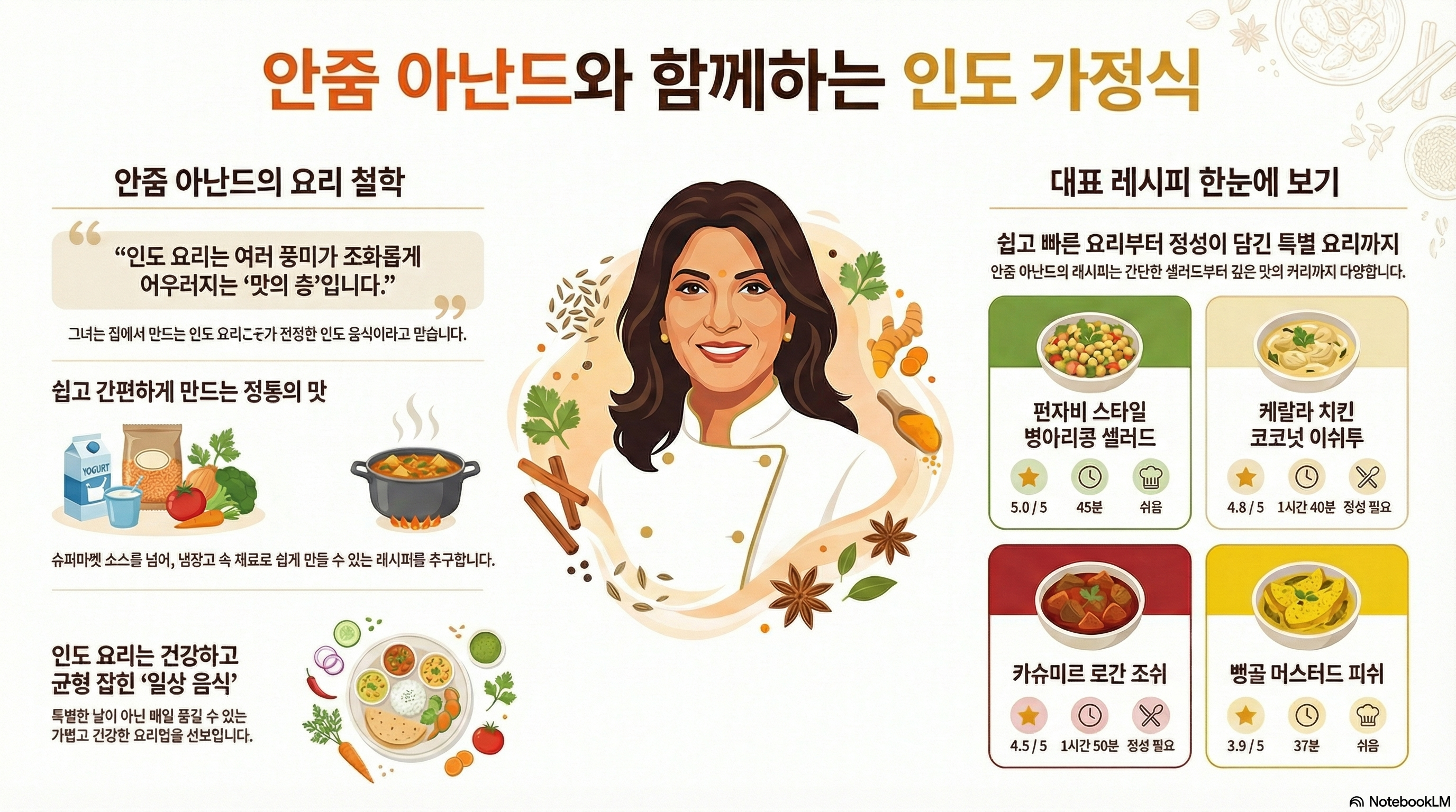 바로 이 두려움을 즐거움으로 바꾸기 위해 평생을 바친 요리사가 있습니다. 베스트셀러 요리책 저자이자 TV 쇼 호스트인 **안줌 아난드(Anjum Anand)**는 "인도 요리는 쉽고 건강하며 누구나 만들 수 있다"는 확고한 사명감을 가지고 활동합니다. 그녀에게 인도 요리는 특별한 날에만 먹는 외식이 아니라, 신선한 재료와 향신료로 건강과 맛의 균형을 맞춘 즐거운 일상의 음식입니다.