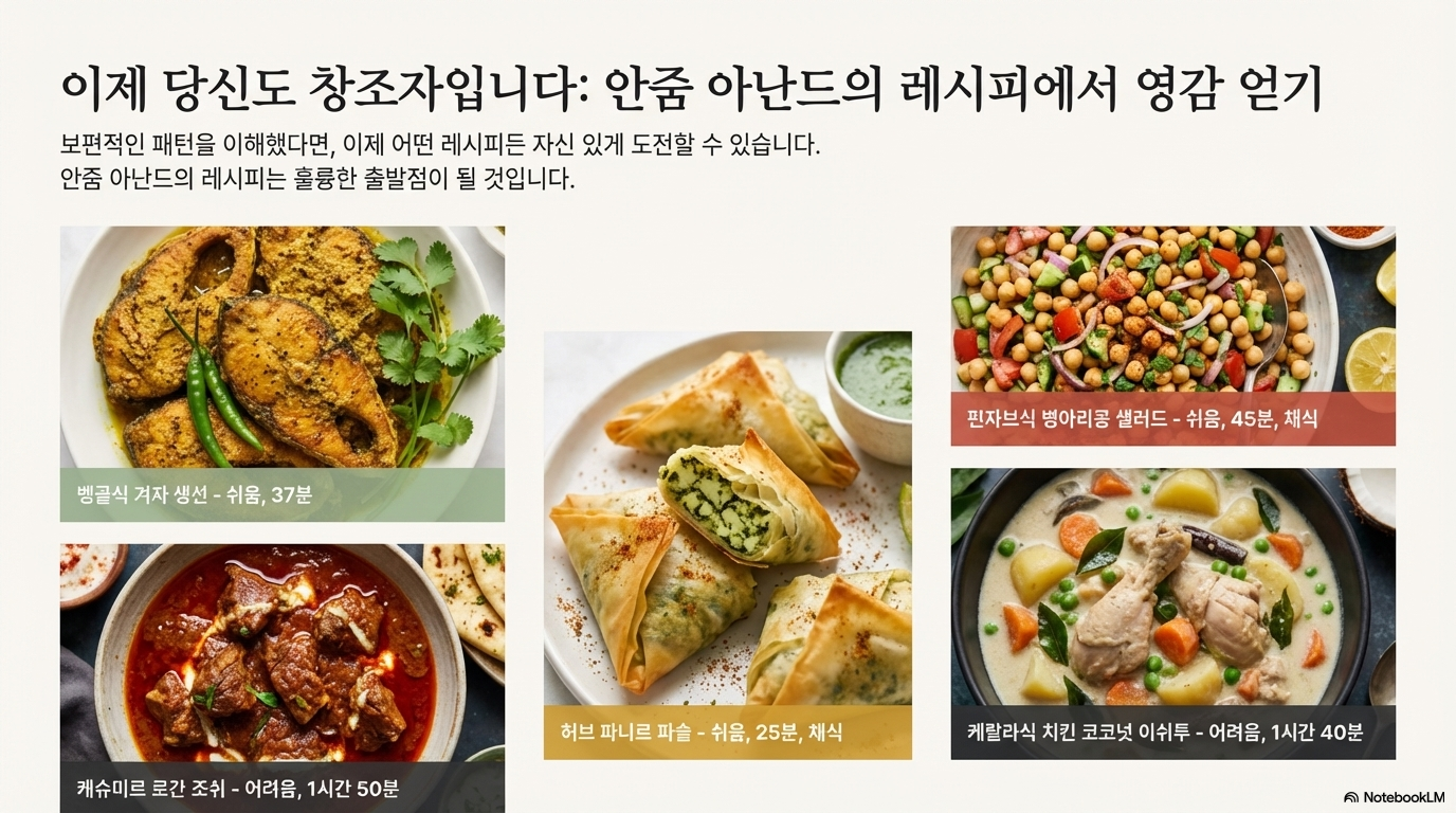 안줌 아난드의 접근법은 인도 요리에 대한 우리의 인식을 근본적으로 바꿉니다. 더 이상 인도 요리는 복잡한 레시피를 암기해야 하는 어려운 과제가 아닙니다. 그녀가 말하는 간단한 '시스템'이란 바로 이것입니다. 첫째, 5가지 핵심 향신료로 맛의 기초를 다지고, 둘째, 내가 이미 잘 아는 재료에서 시작해 심리적 부담을 덜며, 셋째, 전통을 가볍게 비틀어 나만의 건강한 요리를 창조하는 것입니다. 이 세 단계가 바로 복잡한 암기에서 벗어나 즐거운 창조로 나아가는 길입니다.