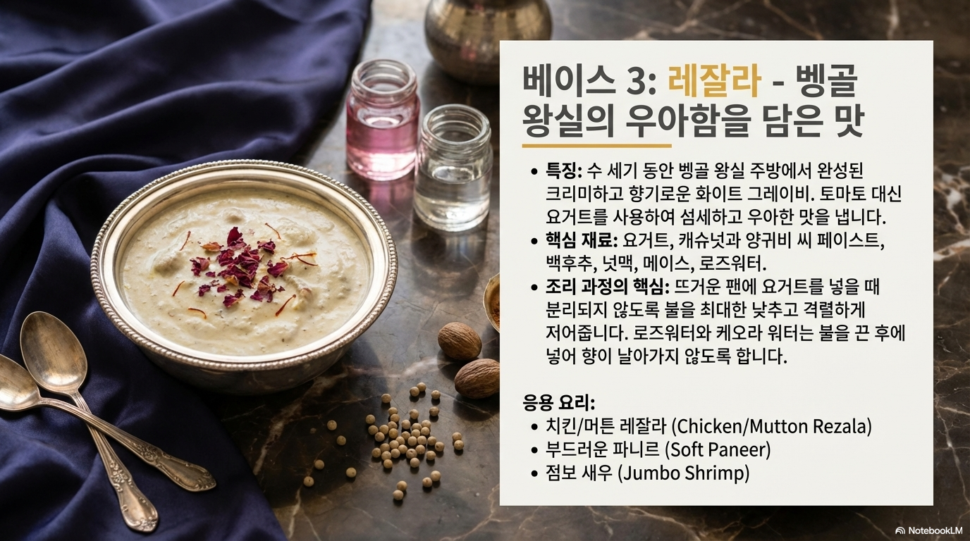 레잘라는 수 세기 전 벵골 왕실 주방에서 완성된 '우아하고 향기로운 흰색 그레이비'입니다. 토마토 대신 요거트를 사용하여 부드러우면서도 깊은 맛을 냅니다. 레잘라는 '마법 공식'의 4단계에서 토마토 대신 요거트를 사용하는 독창적인 접근법을 보여주며, 섬세한 기술로 완전히 새로운 차원의 맛을 창조합니다. 핵심은 요거트가 뜨거운 팬에서 분리되지 않도록 불을 아주 낮춘 상태에서 빠르게 젓고, 소량의 전분물을 섞어 안정시키는 기술에 있습니다.