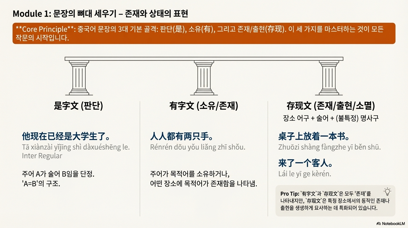 이 문서는 중국어 작문의 가장 기초가 되는 세 가지 핵심 문장 유형인 **'是(shì) 구문', '有(yǒu) 구문', '存现(cúnxiàn) 구문'**의 기본 개념과 정확한 쓰임새를 익히는 것을 목표로 합니다. 중국어는 우리말과 어순과 표현 방식이 달라 초급 학습자가 문장을 만드는 데 어려움을 겪기 쉽습니다.