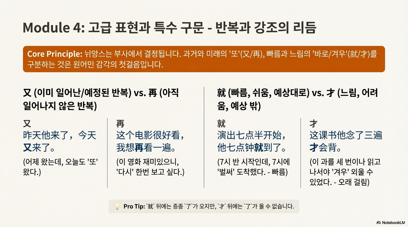 동작의 반복을 나타내지만, 시제와 뉘앙스에 따라 명확히 구분된다. 교재는 '又'를 중심으로 설명한다.
