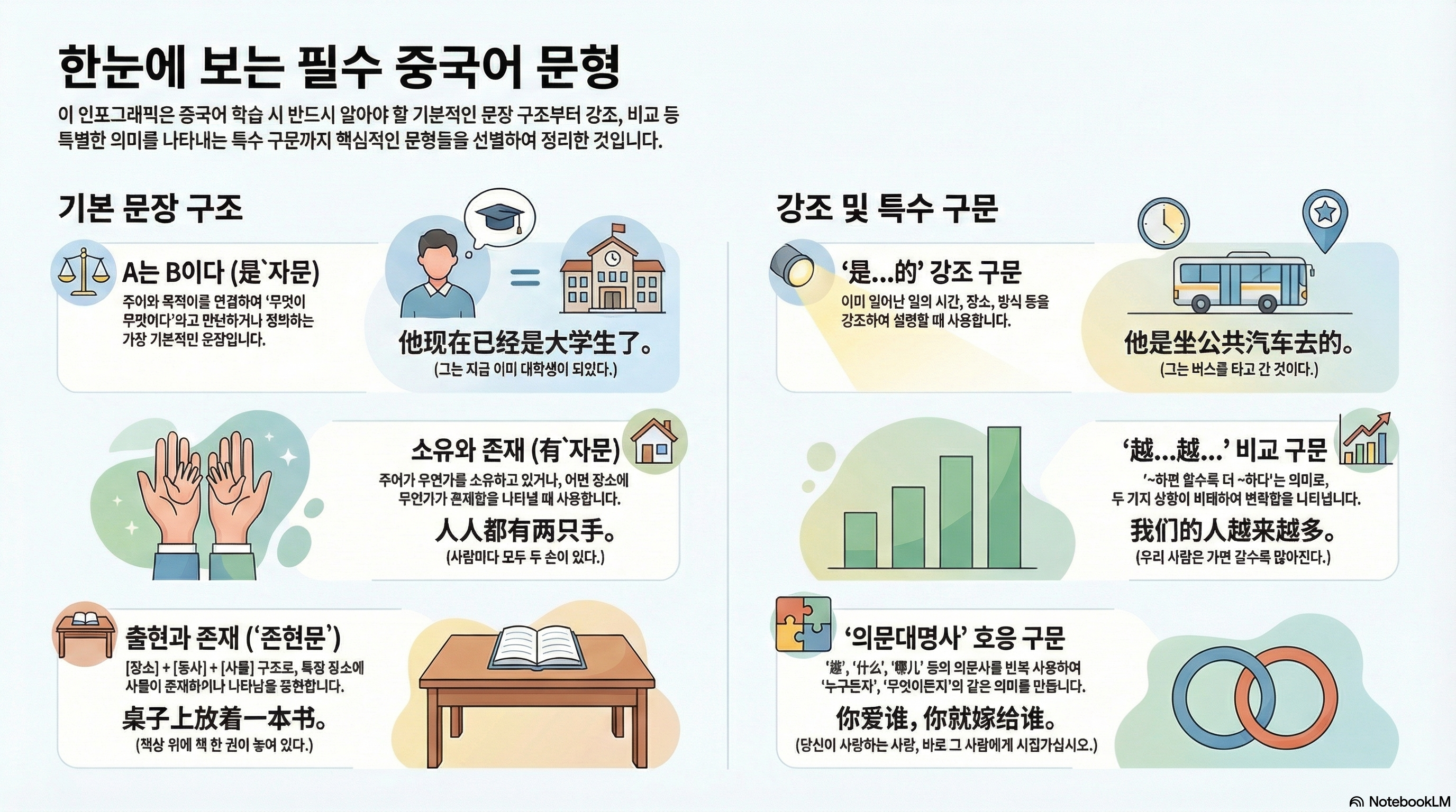 이 세 가지 기본 문형은 각각 판단, 소유, 상태를 나타내는 문장의 뼈대를 이룹니다. 이 구문들을 완벽히 마스터하는 것은 단순히 문법 지식을 쌓는 것을 넘어, 여러분의 중국어를 한 단계 더 자연스럽고 논리적으로 만들어 줄 것입니다. 지금부터 중국어 문장 만들기의 자신감을 키우는 첫걸음을 함께 내디뎌 봅시다.