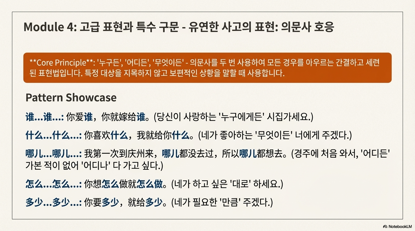 | 의문사 호응 | 谁...谁... / 哪儿...哪儿... / 什么...什么... 등 동일 의문사를 앞뒤 절에 사용하여 '...하는 누구든', '...하는 어디든' 등의 의미를 나타낸다. | 你爱谁, 你就嫁给谁。 (당신이 사랑하는 그 사람에게 시집가십시오.) 嘴里怎么说, 笔下就怎么写。 (입으로 말하는 대로, 붓으로 그대로 쓴다.) |
