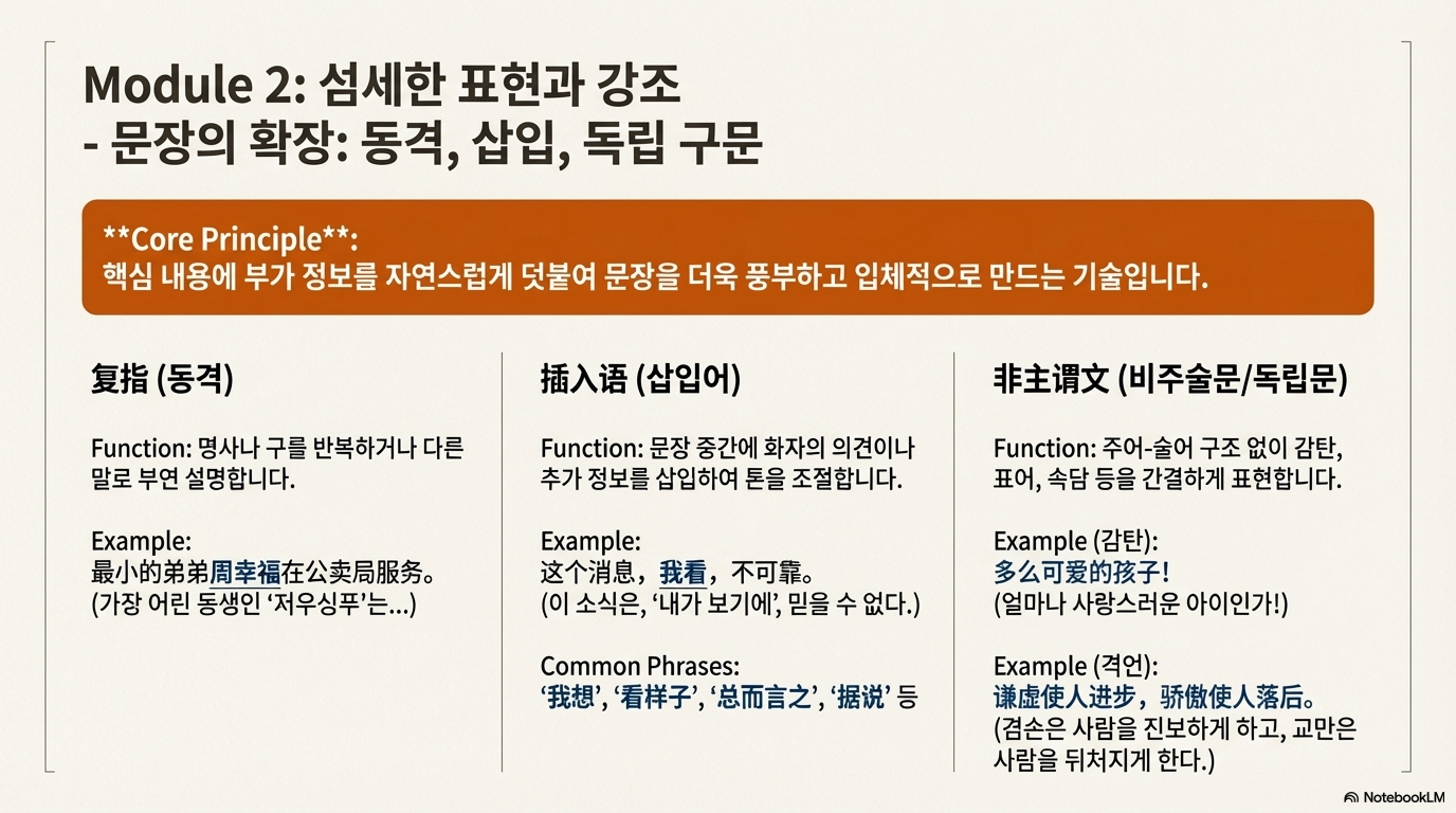 | 插入语 (삽입어) | 문장 중간에 삽입되어 화자의 견해, 추측, 출처 등을 나타내는 어구. 예: 我看(내가 보기에), 听说(듣자 하니). |