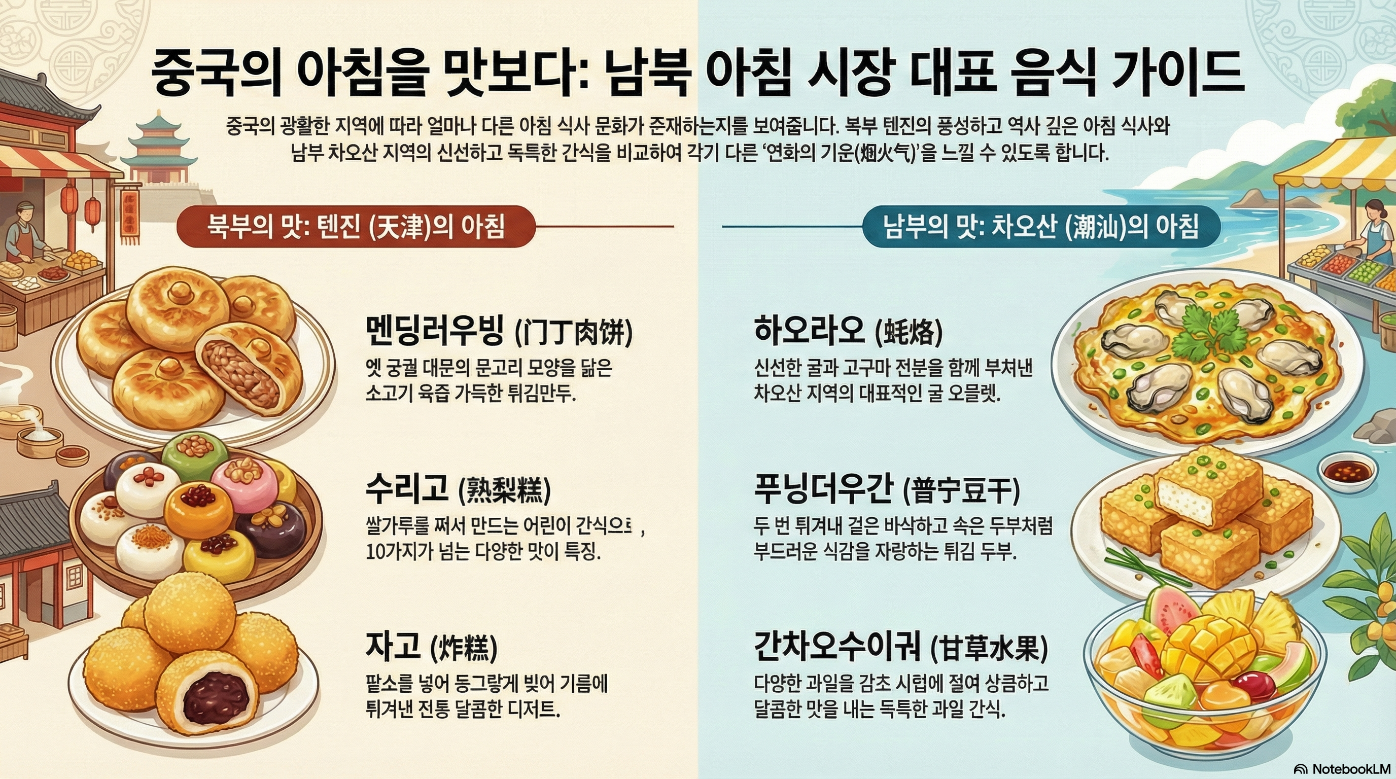 영상은 산터우(남부)와 톈진(북부)의 아침 식사를 명확히 대조하며 중국 음식 문화의 광범위한 지역적 다양성을 보여준다.