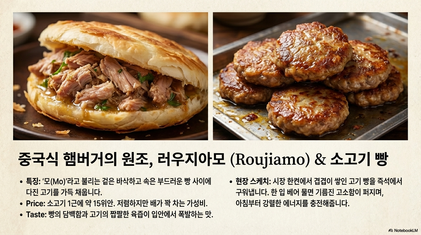 화덕에서 막 구워낸 뜨끈한 빵(馍) 사이에 장시간 조려낸 고기를 채워 넣는 '중국식 햄버거'입니다. 시장에서는 '하오츠더 다지아모!(好吃的大夹馍!)'를 외치는 상인들의 목소리가 끊이지 않을 만큼 인기 있는 메뉴입니다. | 고기만 넣는 것보다 파나 고수 등 채소를 추가하면 느끼함을 잡고 풍미를 더할 수 있습니다. |