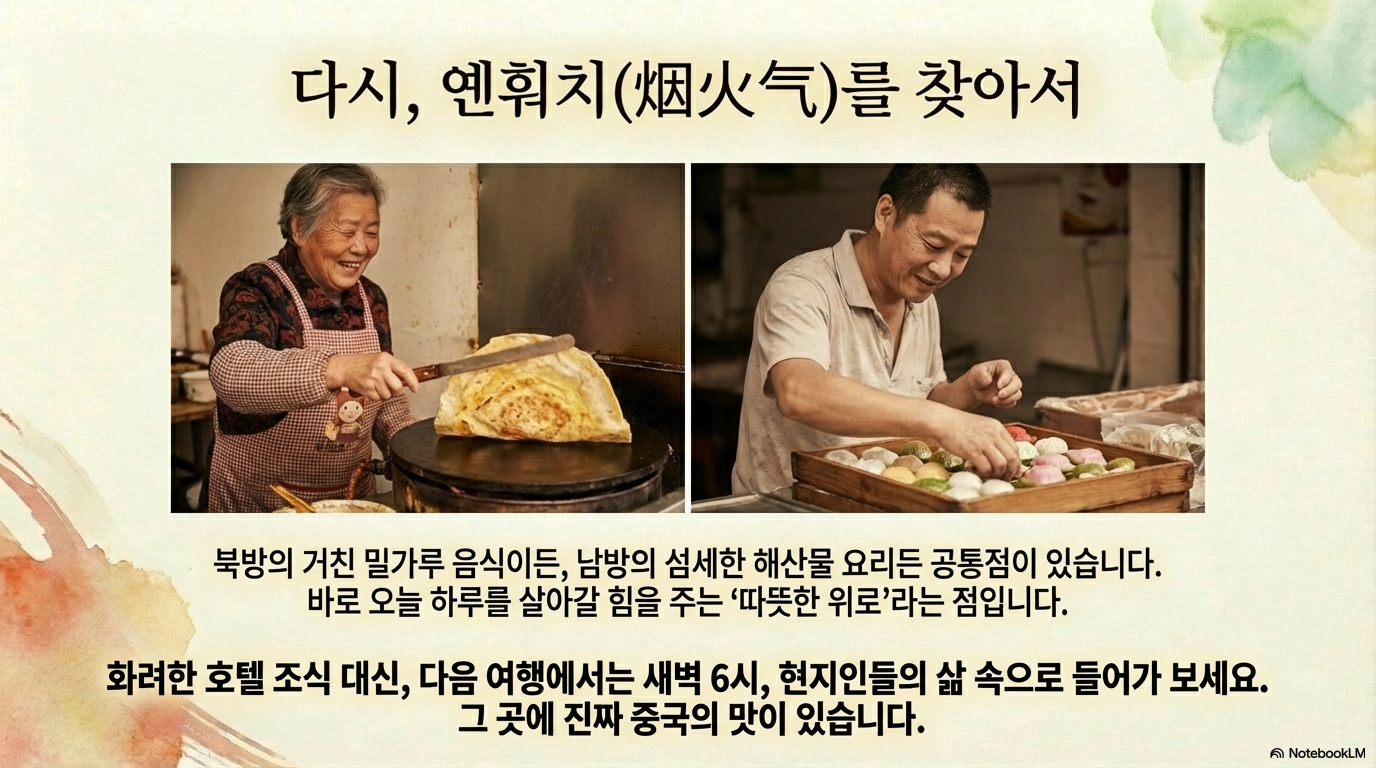 지금까지 든든한 만두부터 따뜻한 죽, 바삭한 튀김과 각 지역의 개성 넘치는 간식까지, 중국 아침 시장의 다채로운 음식들을 함께 살펴보았습니다. 처음 보는 음식 앞에서 더 이상 망설일 필요 없습니다. 이 용어집이 여러분의 중국 아침 시장 탐험에 든든한 자신감을 더해주기를 바랍니다.