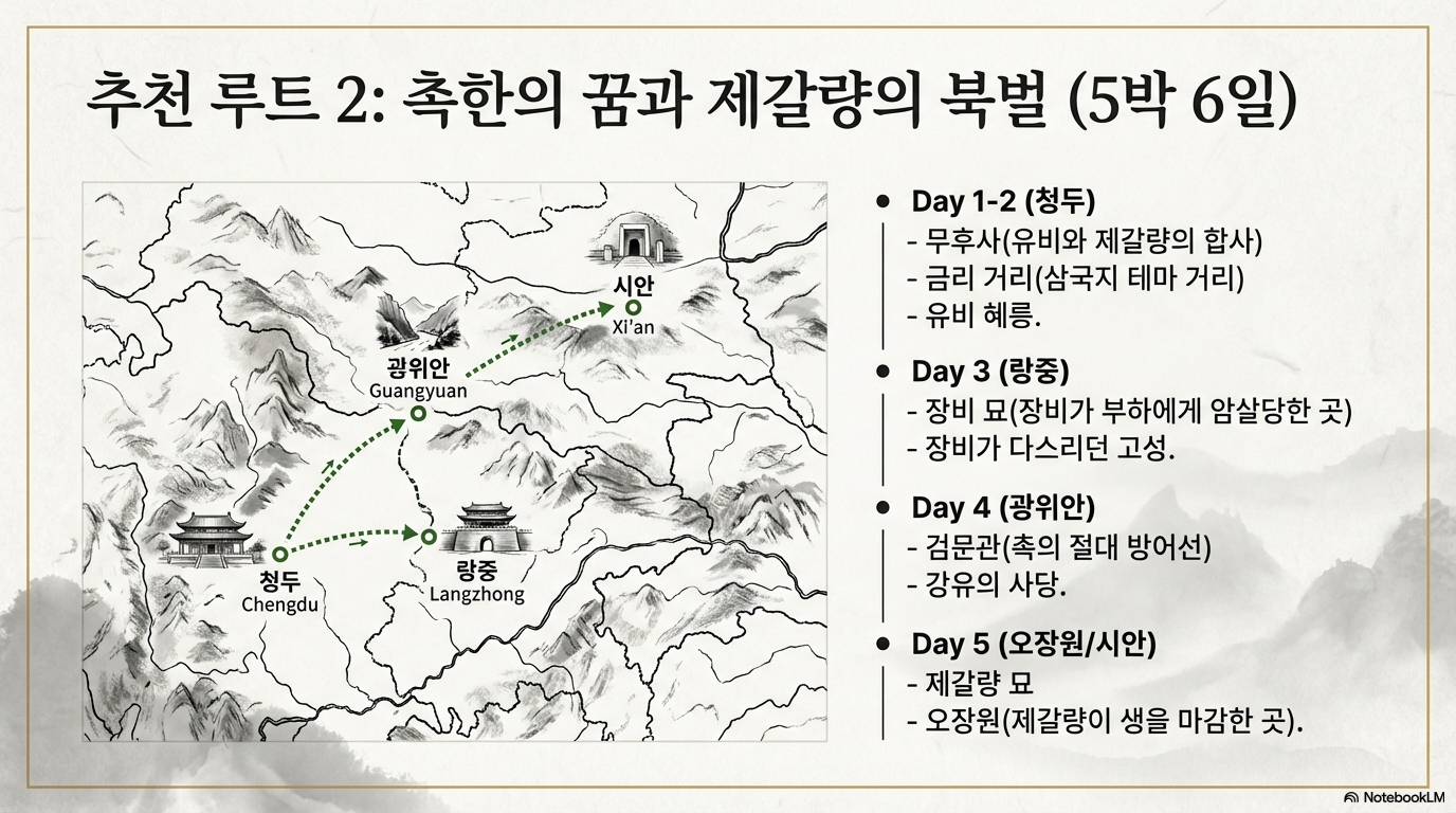 [패널]: 第一條我們稱之為“蜀漢英雄情懷路”。 (dìyī tiáo wǒmen chēng zhī wéi “Shǔhàn yīngxióng qínghuái lù”.) 첫 번째는 '촉한 영웅의 정서' 길입니다.