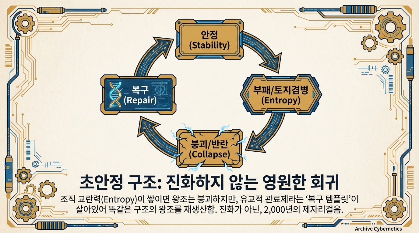 - 복구: 반란 이후 독소가 사라진 자리에 다시 유교 이데올로기를 바탕으로 이전과 동일한 구조의 왕조가 재건됩니다. (So what?: 시스템의 복원력이 작동하여 이전의 경로로 회귀함)