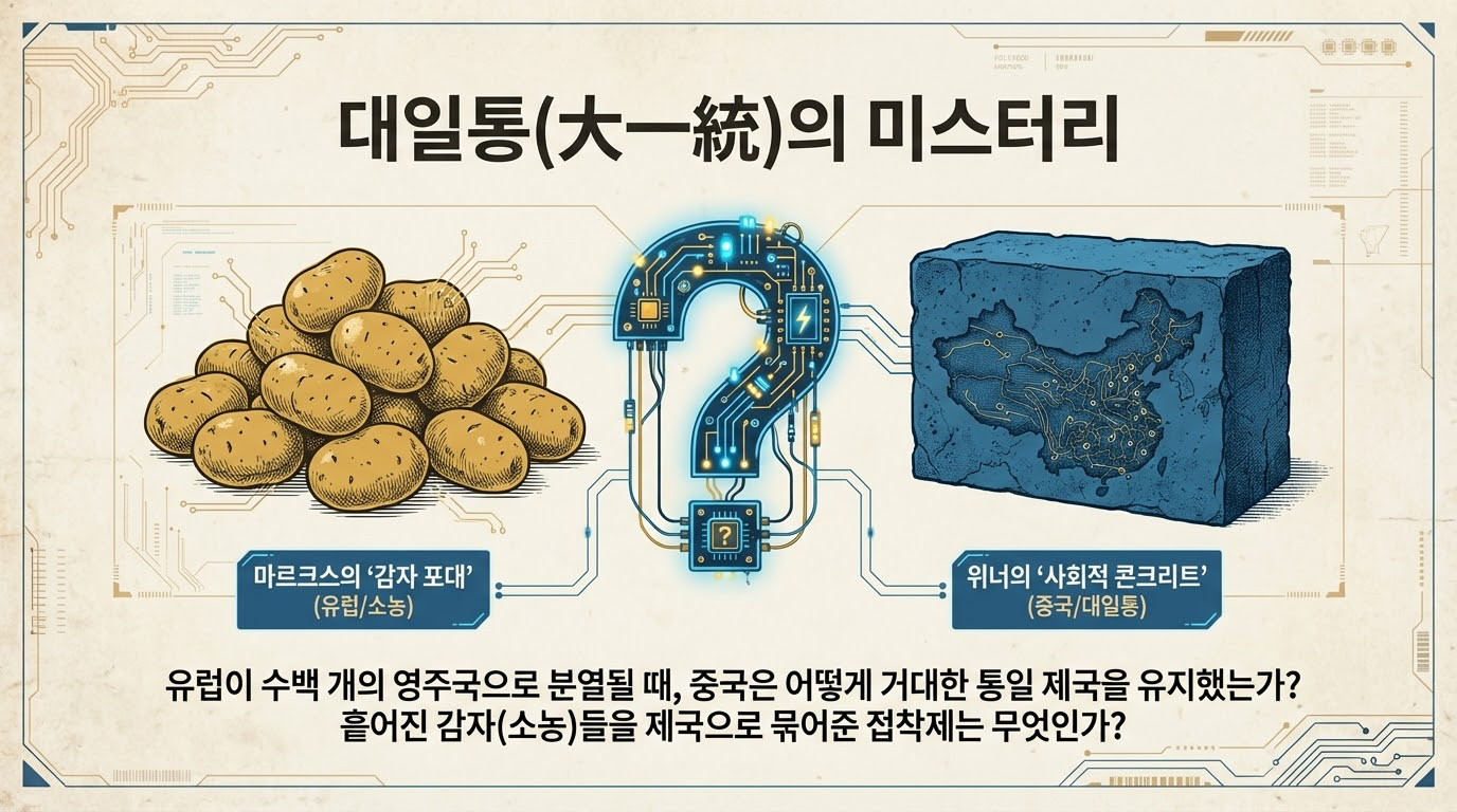 중국의 농업 경제는 자급자족적 소농들이 광범위하게 분산된 형태였다. 마르크스가 묘사했듯, 이들은 **‘마늘 자루 속의 감자들’**과 같아서 생활 조건은 유사하나 상호 간 유기적인 조직 결속력이 결핍되어 있었다. 이러한 내재적 조직력의 부재는 사회적 소통의 공백을 초래하며, 역설적으로 이 공백을 메우기 위해 강력한 외부의 힘, 즉 **‘사회적 소통의 콘크리트’**로서의 관료 기구와 유교 이데올로기가 개입하는 ‘대일통’ 체제를 필연적으로 요청했다. 거대 수리 시설 건설과 국방이라는 공공 과업은 이러한 경제적 분산성을 강제적으로 통합할 전제 정치를 정당화하는 물적 토대가 되었다.