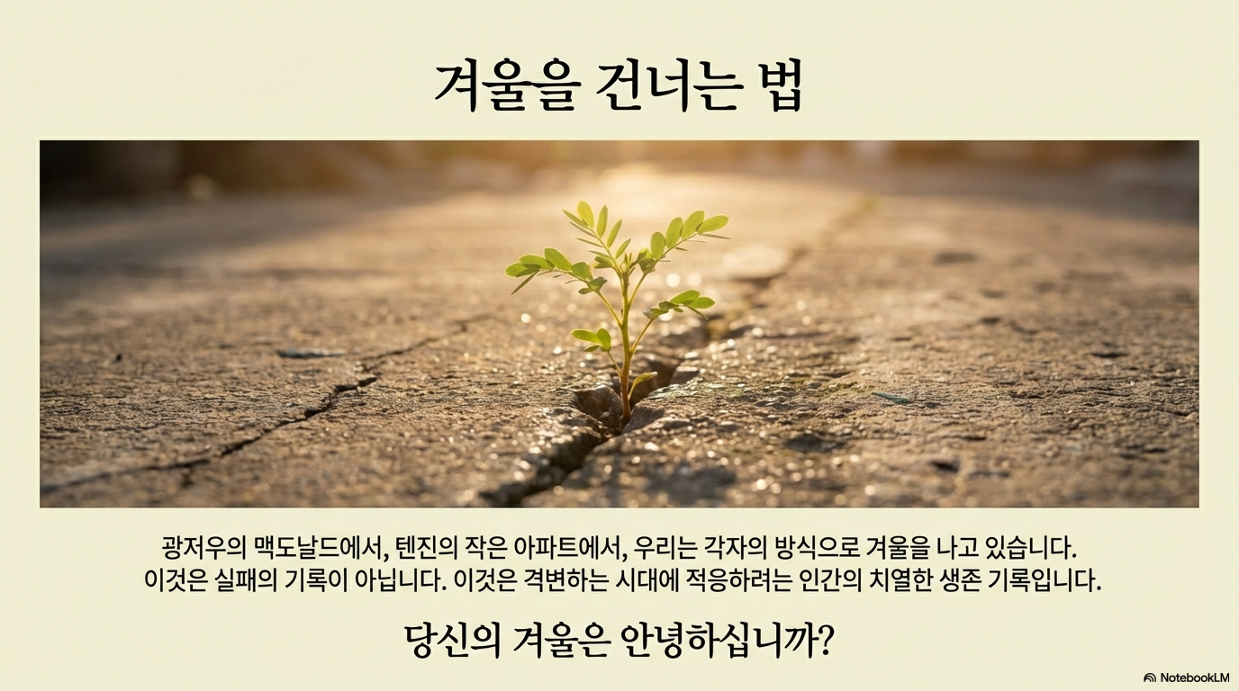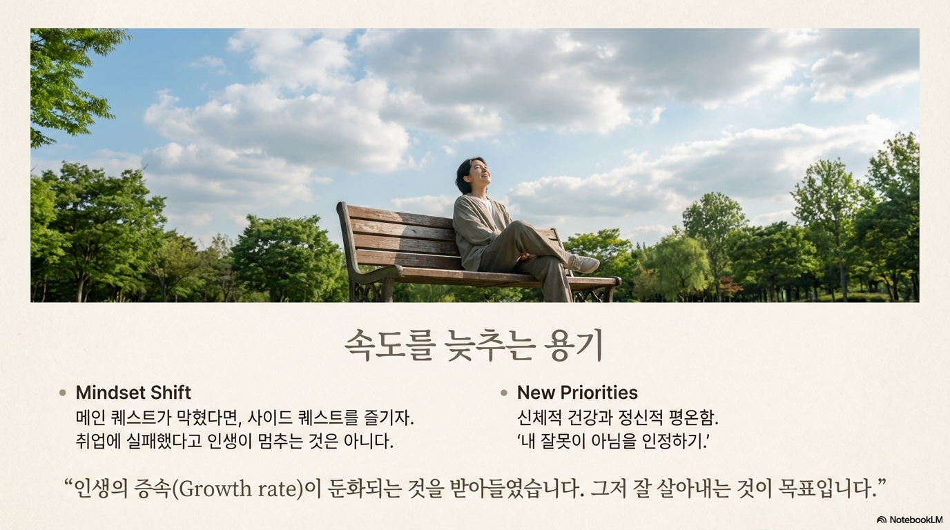 전략가로서 조언하건대, 지금은 성장이 아닌 '생존' 자체가 실력이 되는 시대입니다. 취업이 되지 않는 것을 자아의 실패로 규정하는 대신, 저성기 시대를 버텨내기 위한 **'전술적 후퇴'**가 필요합니다.