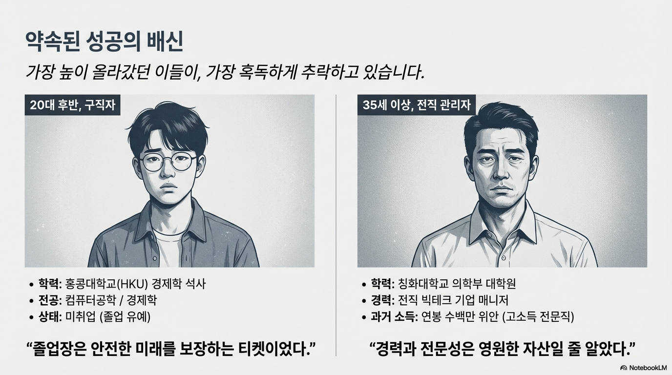 - 저임금 시장의 거부: 생존을 위해 낮은 단계의 일자리에 지원해도, 기업은 고학력자가 금방 떠날 것을 우려해(Overqualified) 채용을 기피합니다.