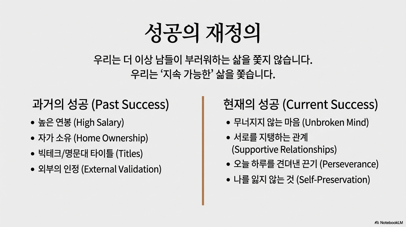 | 사회적 위상 | 대기업 직함, 타인의 시선, 학벌의 자부심 | 실질적인 현금 흐름, 신체적 건강 |