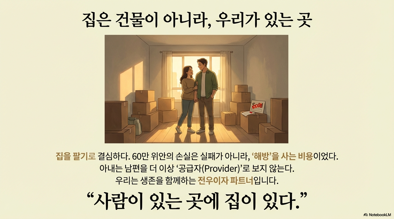 "집은 자산 가치로만 평가받는 투자 대상이 아닙니다. 사람이 있는 곳이 집이고, 집은 그저 우리 가족의 삶과 온기를 담는 '그릇'일 뿐입니다. 침몰하는 자산이라는 배에 끝까지 매달려 가족 모두가 익사할 필요는 없습니다."