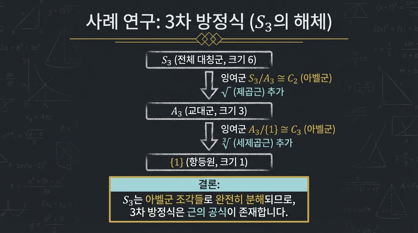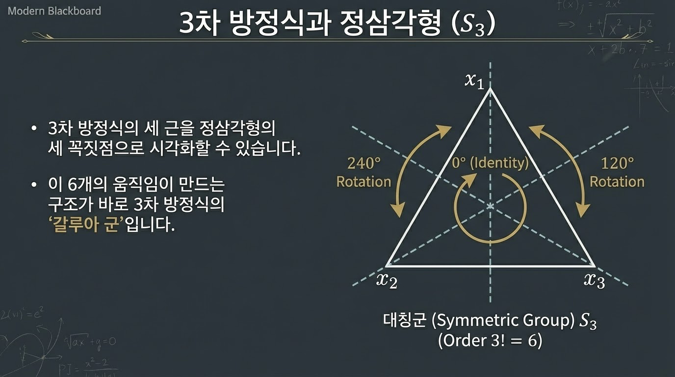 - 구조적 열쇠: 3차 방정식은 이러한 대칭의 모임을 단계적으로 쪼개어 단순화할 수 있는 **'정규 부분군'**이라는 구조가 존재합니다. 이것이 바로 '근의 공식'이라는 열쇠의 정체였습니다.