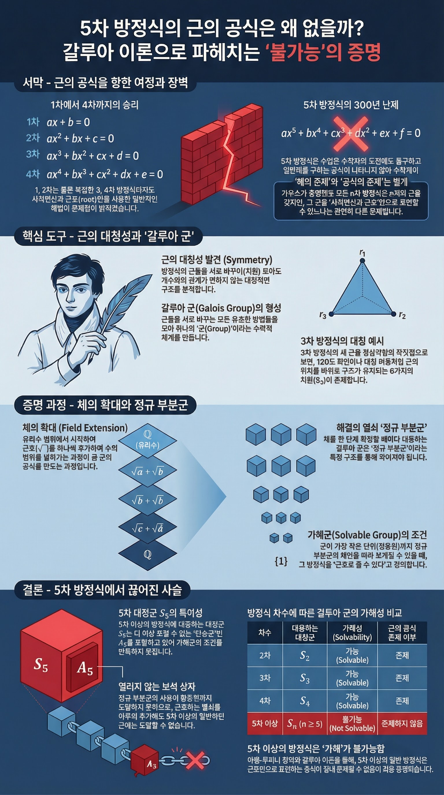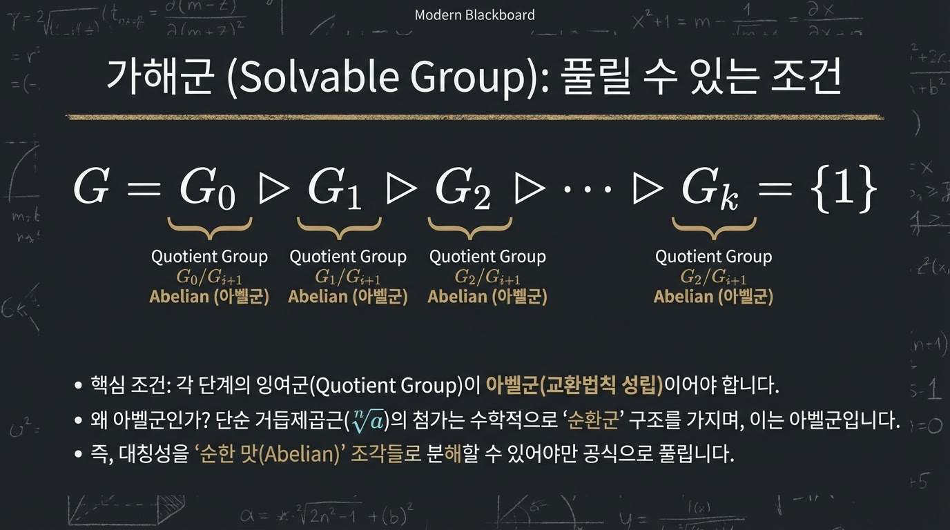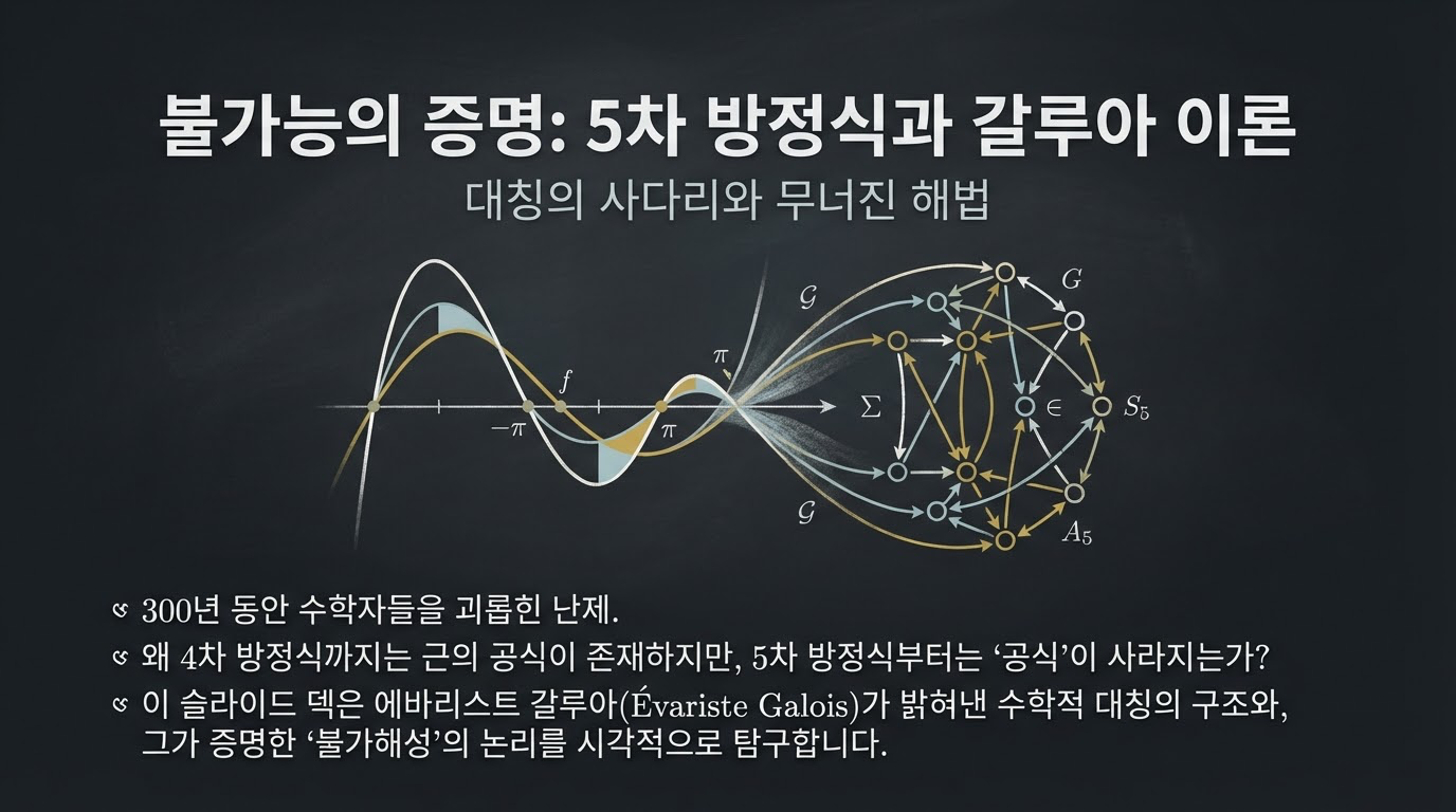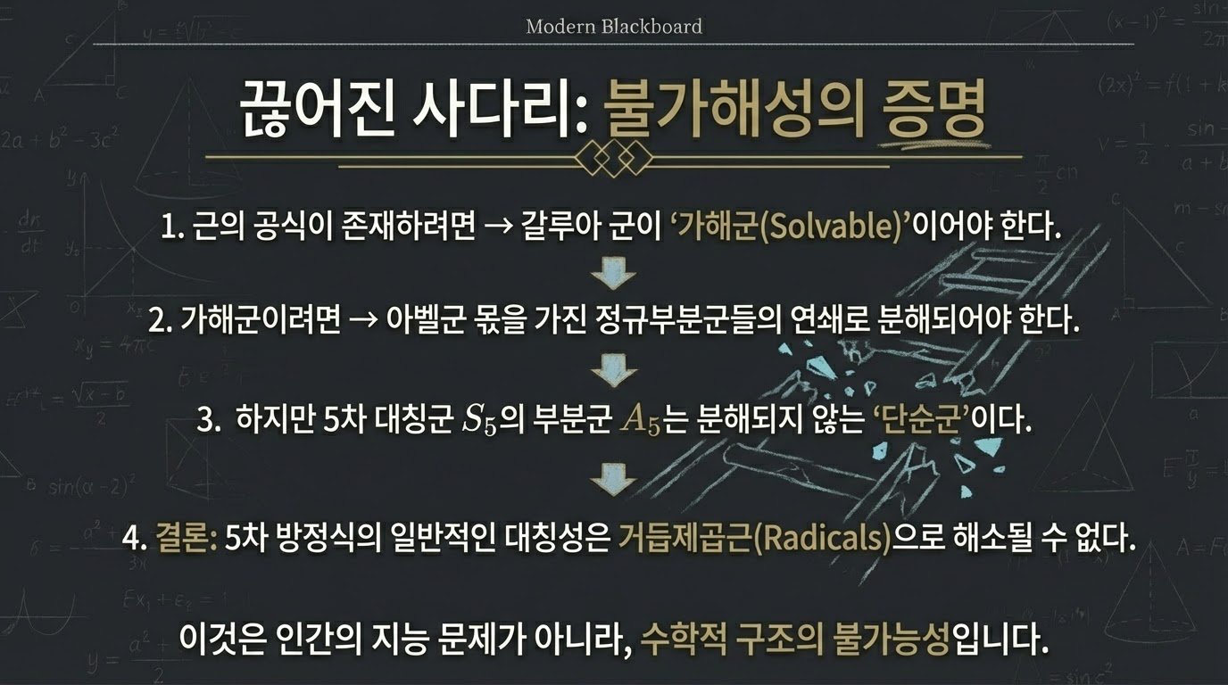 여기서 중요한 점은 **"해(Root)가 없는 것이 아니라, 그 해를 사칙연산과 제곱근만으로 표현할 수 있는 '공식'이 존재할 수 없다"**는 것입니다. 이는 수학의 패러다임을 '계산'에서 '구조'로 옮겨놓은 대혁명이었습니다.