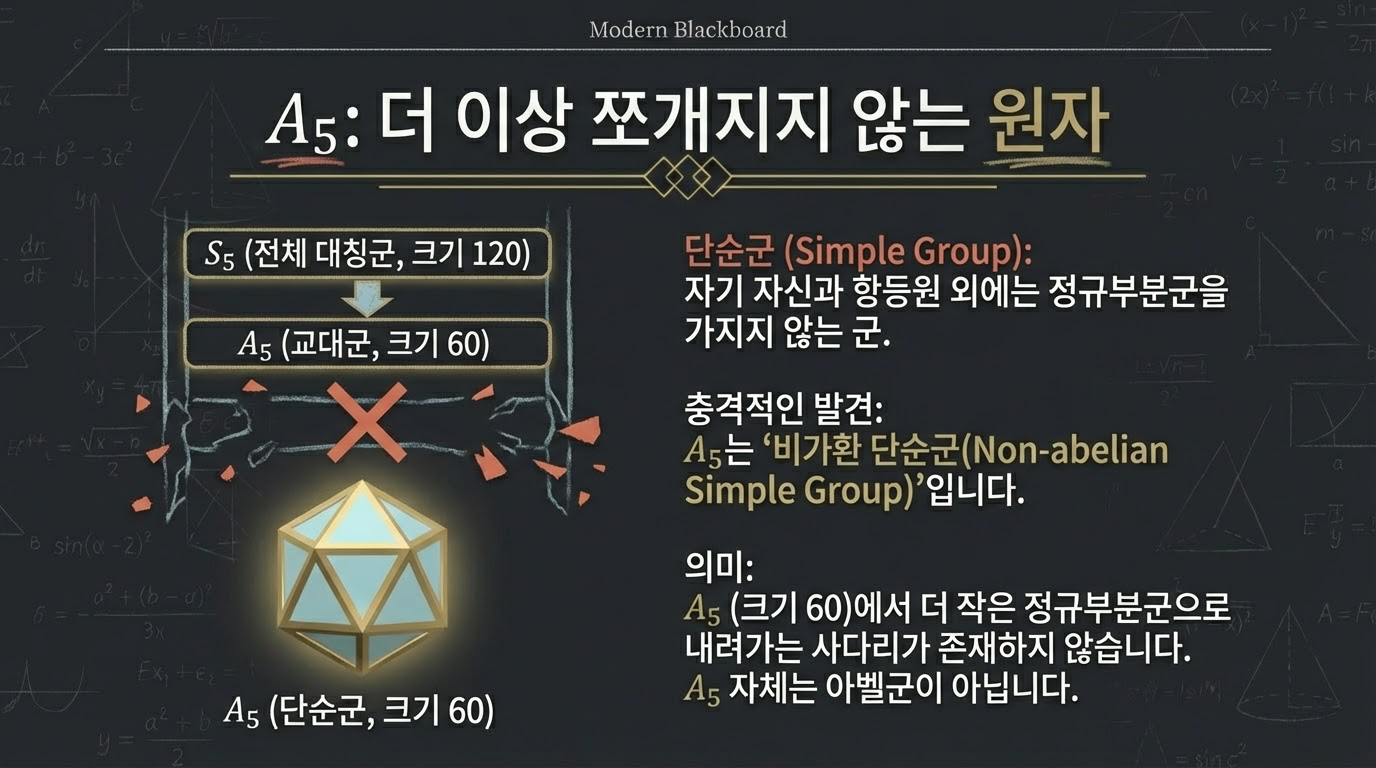 5차 이상의 방정식의 일반적인 대칭군은 S_n (n \ge 5)입니다. S_5 내부의 교대군(Alternating Group)인 A_5는 갈루아 이론의 관점에서 결정적인 장벽이 됩니다. A_5는 자기 자신과 항등원 외에는 정규 부분군을 갖지 않는 **'단순군(Simple Group)'**이며, 동시에 아벨 군이 아닙니다. 따라서 더 이상 아벨 몫군으로 축소될 수 없는 '구조적 막다른 골목'에 이르게 됩니다.
