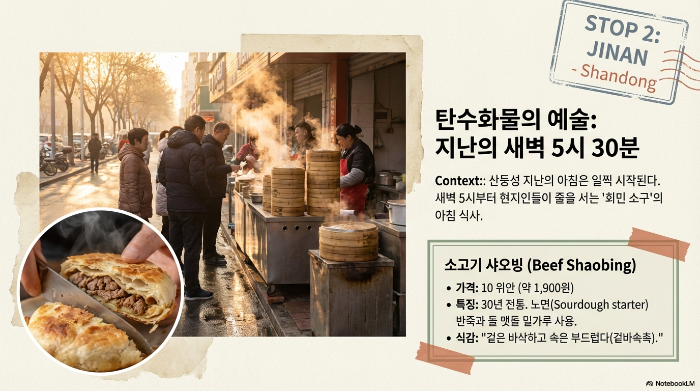 - 시간이 빚은 질감(지난 쇠고기): 지난의 쇠고기 샤오빙에 들어가는 고기는 7~8시간 동안 푹 삶아냅니다. 현지 표현으로 '희바란(稀巴烂)'이라 할 만큼 흐물흐물하게 녹아내릴 정도로 삶아야 비로소 입안에서 부드럽게 풀리는 질감이 완성됩니다.