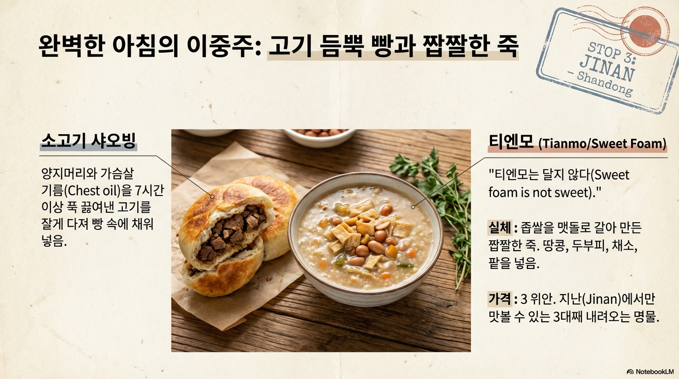 질문 3: 지난(제남)의 명물인 '티엔모(甜沫)'는 이름과 달리 어떤 맛을 내며, 주요 재료는 무엇입니까? 티엔모는 이름에 '달다(甜)'는 글자가 들어가지만 실제로는 짠맛이 나는 음식입니다. 맷돌로 간 조를 베이스로 하여 두부피, 채소, 붉은 팥 등을 넣어 만들며 지난 사람들의 대표적인 아침 메뉴입니다.