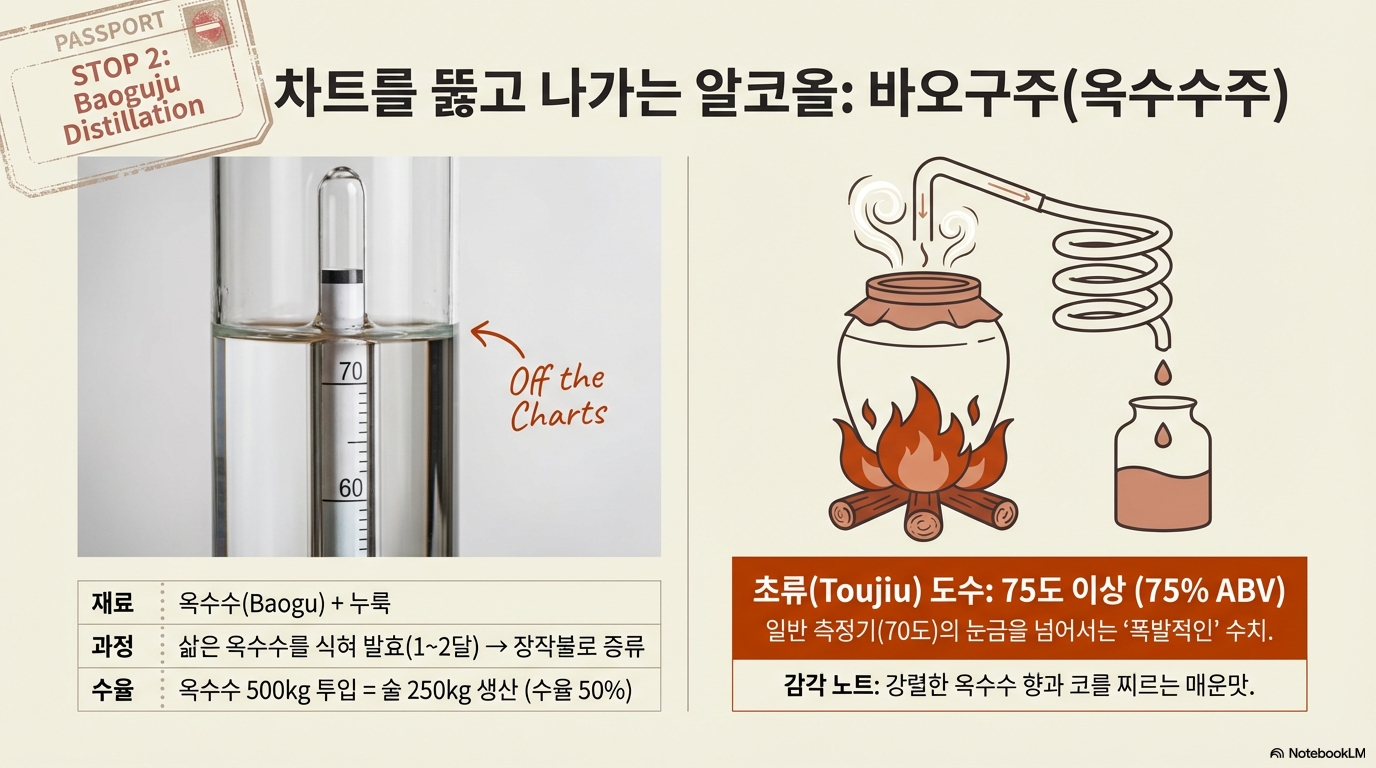 - 도수 분석: 증류 초기 추출되는 **'두주(头酒)'**는 시판되는 70도 측정기의 한계를 가볍게 뛰어넘습니다. 현장 측정 시 측정기의 눈금이 한계치를 초과하는 '폭표(爆表)' 현상이 발생하며, 실제 도수는 75도 이상으로 평가됩니다. 표준적인 제품 역시 최소 50도 이상의 고도수를 유지합니다.