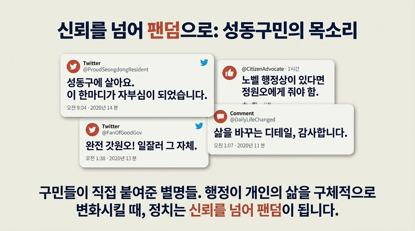 이 '기적' 같은 수치는 2024년에도 91%를 기록하며 일시적인 현상이 아님을 증명했습니다. 정원오 성동구청장이 강조하는 **'세금 안 아까운 행정'**은 단순한 정치적 수사가 아닙니다. 이는 복잡한 행정 수치 너머, 시민의 일상을 응원하고 삶의 결을 어루만지는 '성능 중심의 공감 행정'이 빚어낸 결과입니다.