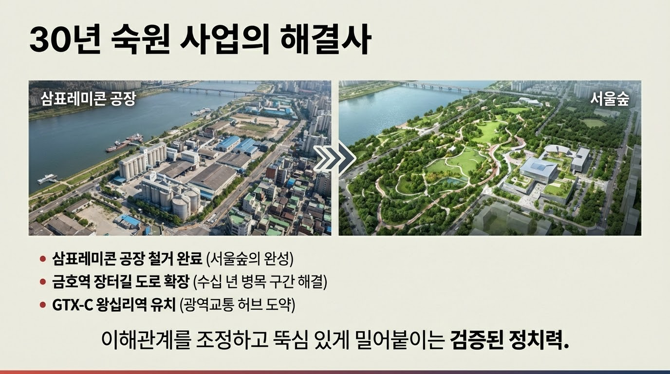 - 스마트 포용과 갈등 해결: '5분 일상정원도시' 정책은 단순한 녹지 조성을 넘어 30년 숙원이었던 '마장동 먹자골목' 철거 갈등을 해결하고 그 자리에 **'마장동 자작나무 숲정원'**을 선물했습니다. 이는 281억 원 규모의 '주거복지 포용도시' 계획으로 이어져, 소외된 이웃까지 모두 품는 따뜻한 혁신으로 완성되고 있습니다.