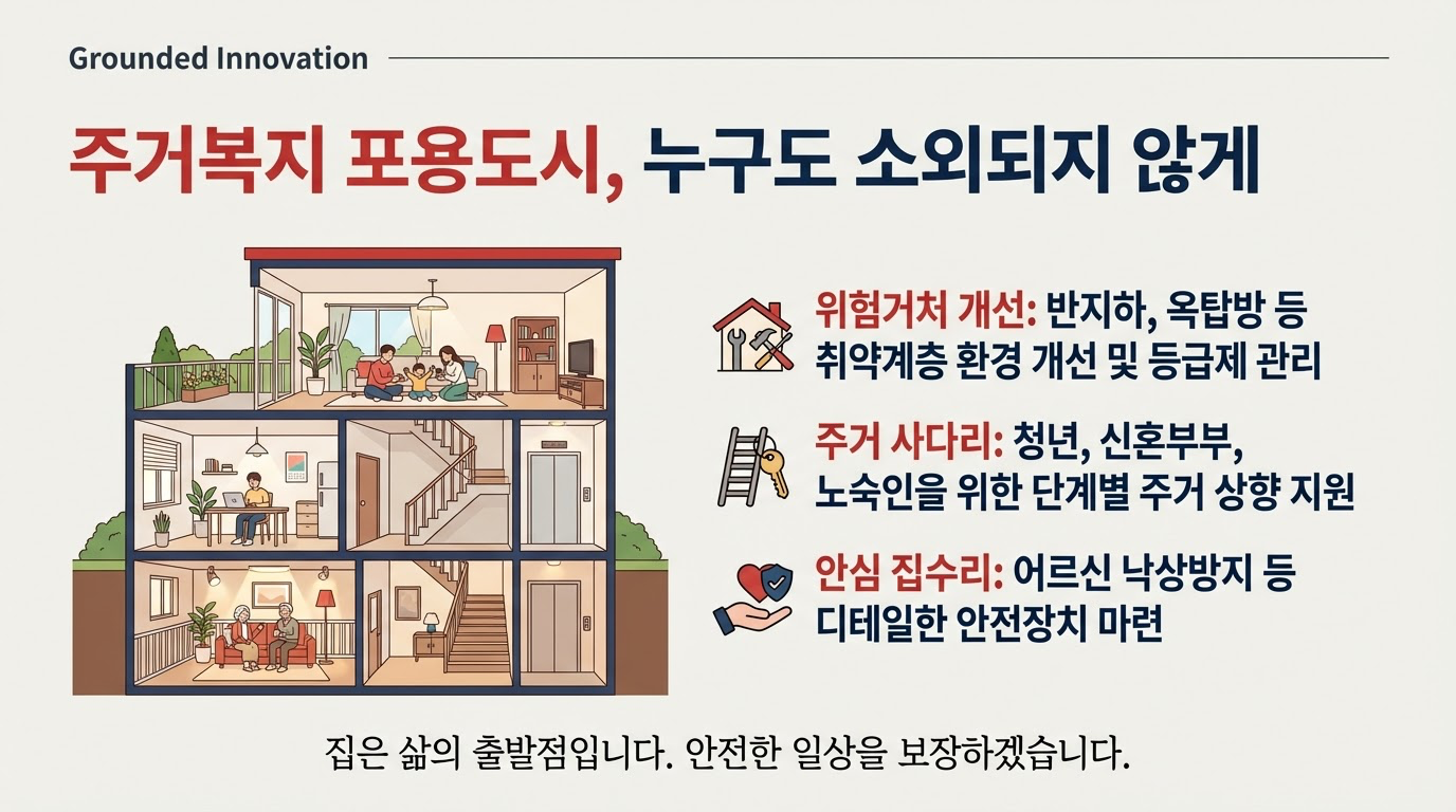 - 약 281억 원 규모의 주거종합계획을 통해 노후 주택을 A부터 D등급까지 나누어 관리하는 **'위험거처 등급제'**를 시행하며, 거동이 불편한 어르신 댁에는 낙상 방지 안전 손잡이와 미끄럼 방지 시설을 설치해 드립니다.