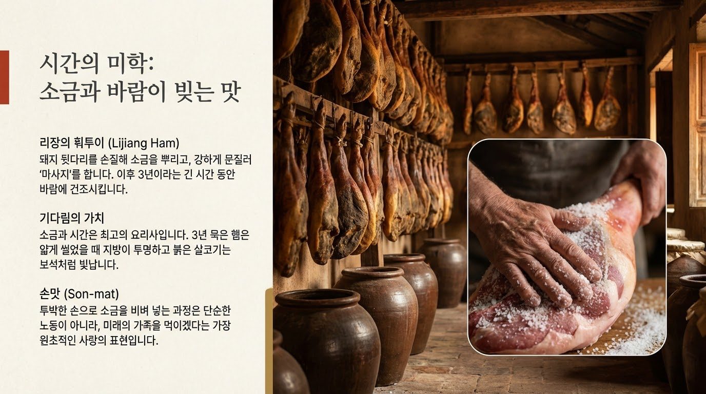 - 과학적 원리: 높은 습도에서 부패를 막기 위해 대량의 소금을 사용하는 **'염장(Salting)'**은 삼투압 현상으로 수분을 제거하고 발효 균의 번식을 돕습니다. 3년 숙성된 화퇴(햄)는 이 기후가 빚은 예술품입니다.