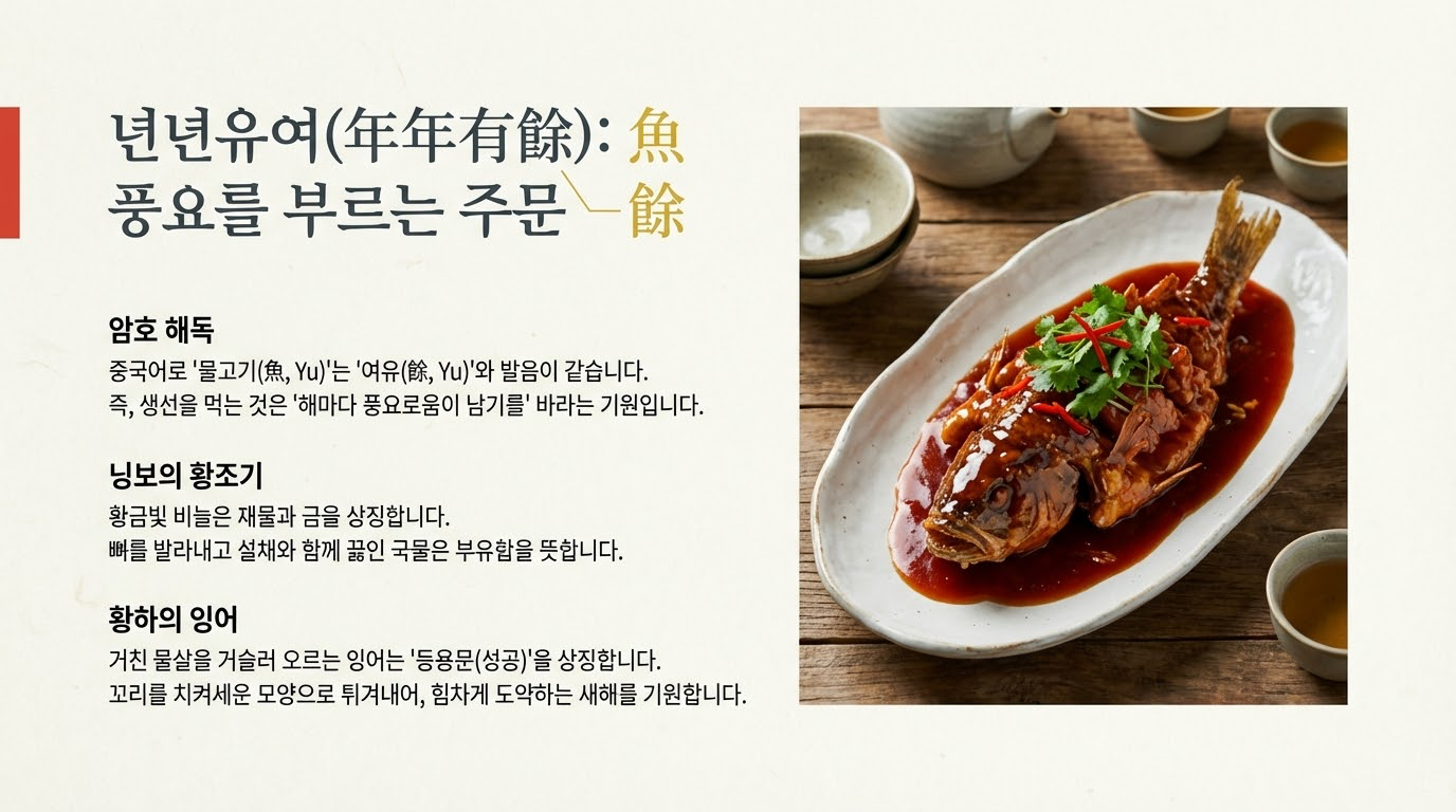 - 분석: 장백산의 **냉수어(冷水魚)**나 풍요를 상징하는 판터우위(胖頭魚, 대두어) 요리는 '남음(餘)'과 '물고기(魚)'의 동음이의어적 관계를 활용해 끊이지 않는 번영을 기원합니다.