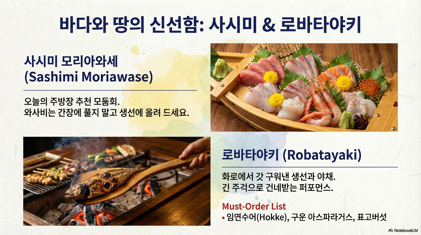 - 로바타야키(炉端焼き): 손님이 보는 앞에서 숯불 화로(로바타)에 신선한 재료를 직접 구워 제공하는 생동감 넘치는 공간입니다.