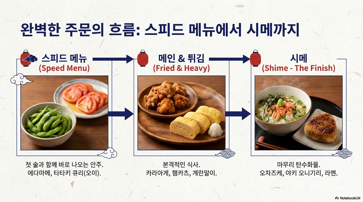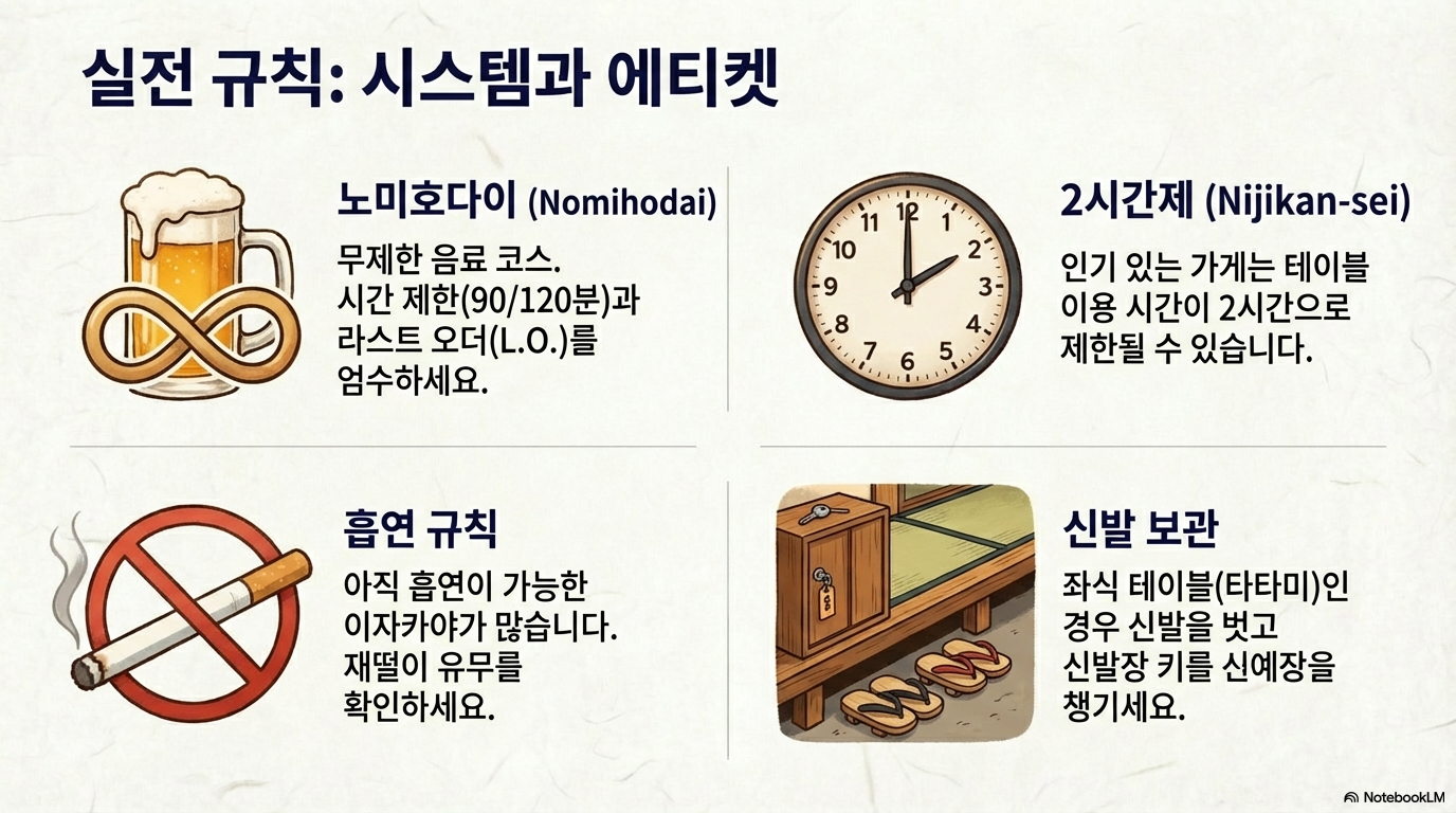 - 운영 메커니즘: 전원에게 맥주가 제공될 때까지 기다리는 '칸파이(건배)' 문화는 주방에 주문이 몰리는 초기 시점에서 조리 시간을 확보해 주는 '페이스 메이커' 기능을 합니다.