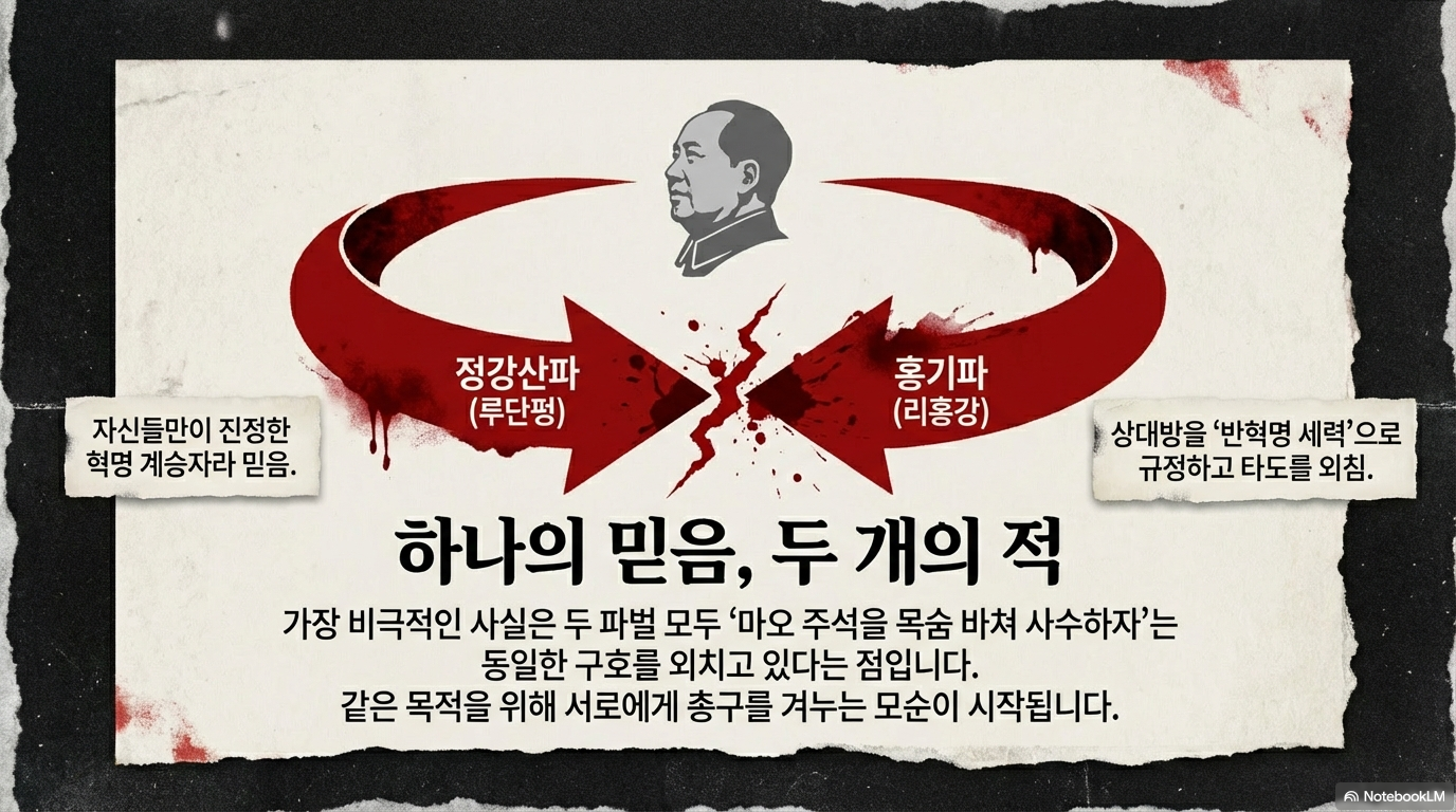 비극의 정점은 **'해석의 독점'**에 있었습니다. '강철산(Jinggangshan)' 파벌과 '홍기(Red Flag)' 파벌은 같은 **'리틀 레드 북(마오쩌둥 어록)'**을 손에 쥐고 서로를 향해 총을 쏘았습니다. 상대방이 주석의 노선을 왜곡하는 '비적'이라 확신했기 때문입니다. 그들에게 어록은 지혜의 샘이 아니라, 상대를 비인간화하고 처단하기 위한 가장 날카로운 흉기였습니다.