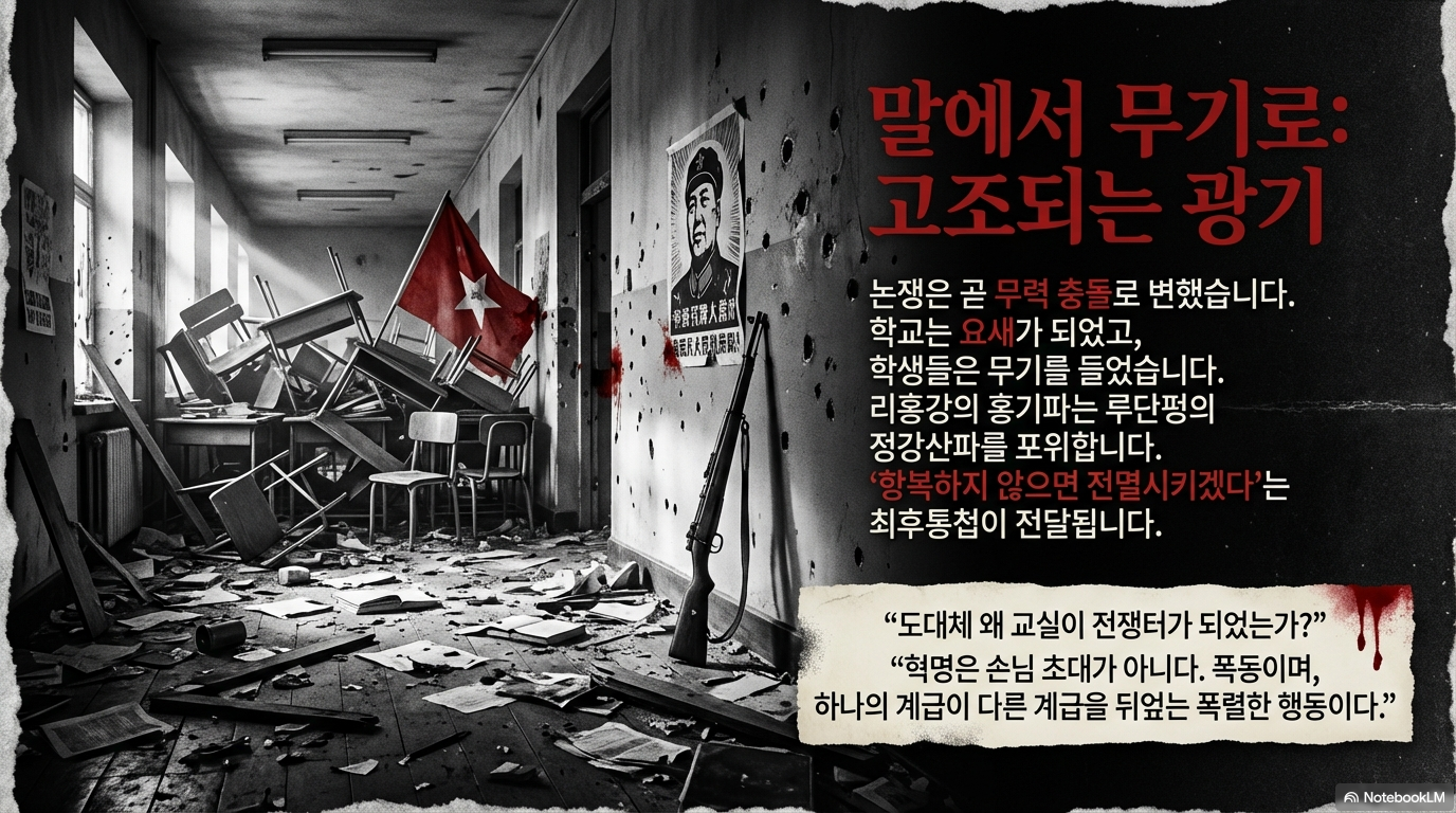 이러한 언어적 세뇌는 '동지'에서 '반동'으로의 변모를 순식간에 정당화합니다. 리훙강과 루단펑의 대화에서 보듯, "노선이 다르면 개인적 행복은 없다"는 논리는 청년들의 가치관을 왜곡하여, 한때의 소중했던 추억을 '혁명의 장애물'로 전락시킵니다. 이제 이 언어적 낙인이 어떻게 무장 투쟁이라는 물리적 실체로 변모했는지 살필 차례입니다.