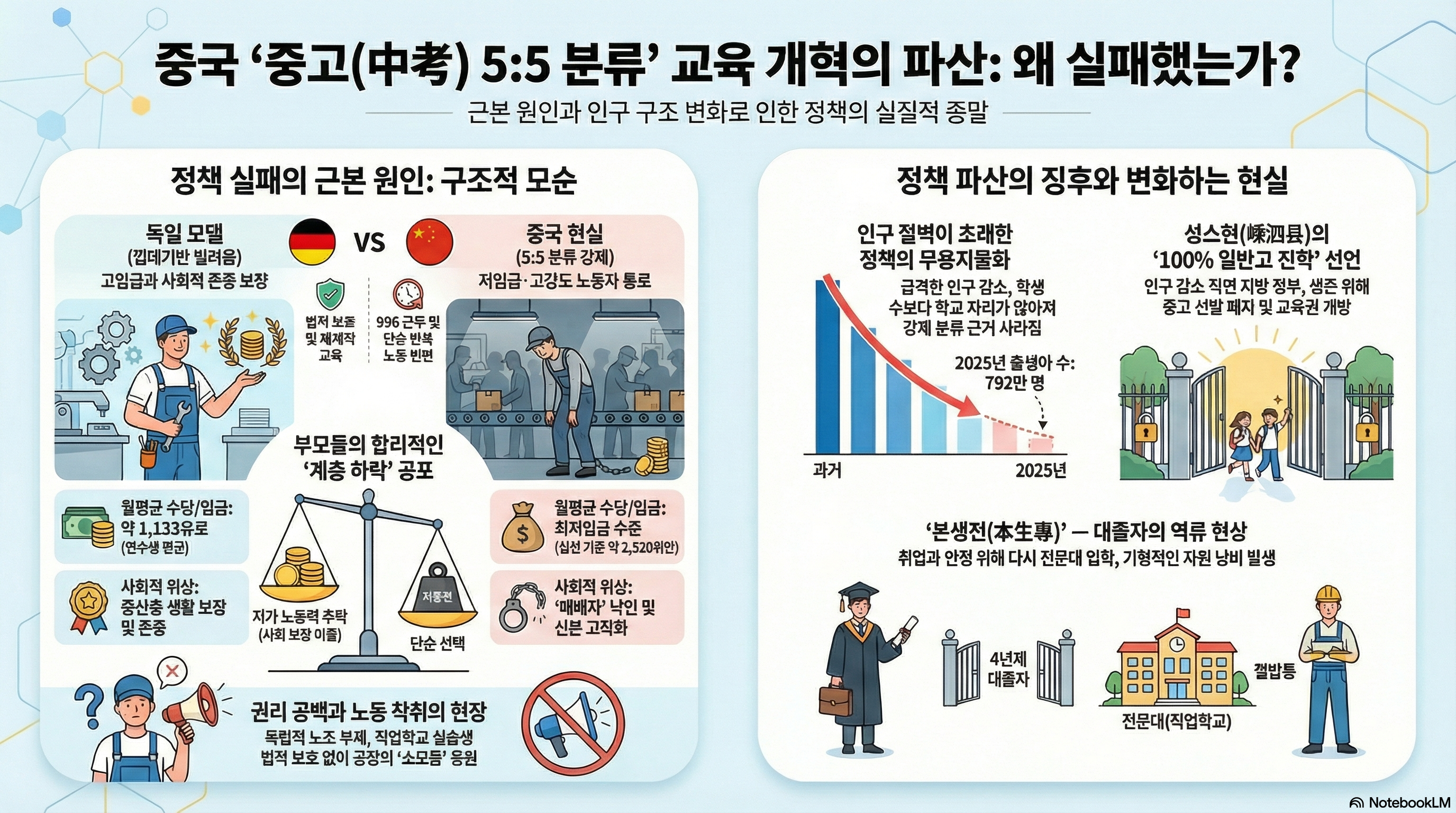 정부는 이를 독일식 모델을 표방한 '미래지향적 설계'라고 홍보했으나, 시장의 반응은 싸늘했습니다. 학부모들이 느끼는 공포는 단순히 '체면'이나 유교적 '사농공상'의 잔재가 아닙니다. 그것은 저신뢰·고위험 노동 시장에서의 합리적 경제 계산에 근거한 생존 본능입니다. 특히 1억 4천만 명에 달하는 유동 아동 및 유수 아동들에게 이 '5:5 분류'는 호구(Hukou) 제도의 장벽을 넘지 못한 이들을 한 번 더 걸러내는 **구조적 배제(Structural Exclusion)**이자, 계층 하락을 공식화하는 경고장으로 작동하고 있습니다.