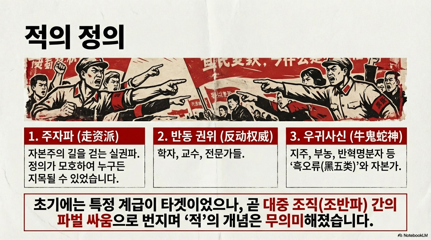 | 초기 대상 | 주자파, 반동 권위주의자, 우파, ‘지부반괴우’(5류 분자) | 상대 파벌(조반파 혹은 보수파) 집단 전체 |