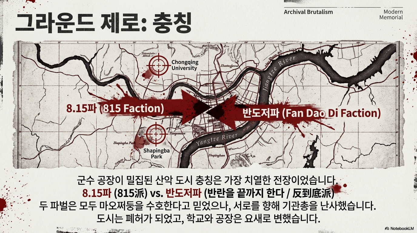 비극적인 점은 두 파벌 모두 자신들만이 마오 주석을 지키는 ‘참된 혁명가’라고 굳게 믿었다는 것입니다. 특히 충칭의 **‘815파’**와 ‘반도저(反到底, 끝까지 조반한다)파’, 그리고 광시의 **‘422파’**와 ‘연지(連指)파’ 등은 같은 구호를 외치면서도 서로를 향해 거침없이 방아쇠를 당겼습니다. 왜 이들은 말로 하는 토론을 멈추고 서로의 목숨을 노리는 전쟁에 투입되었던 것일까요?