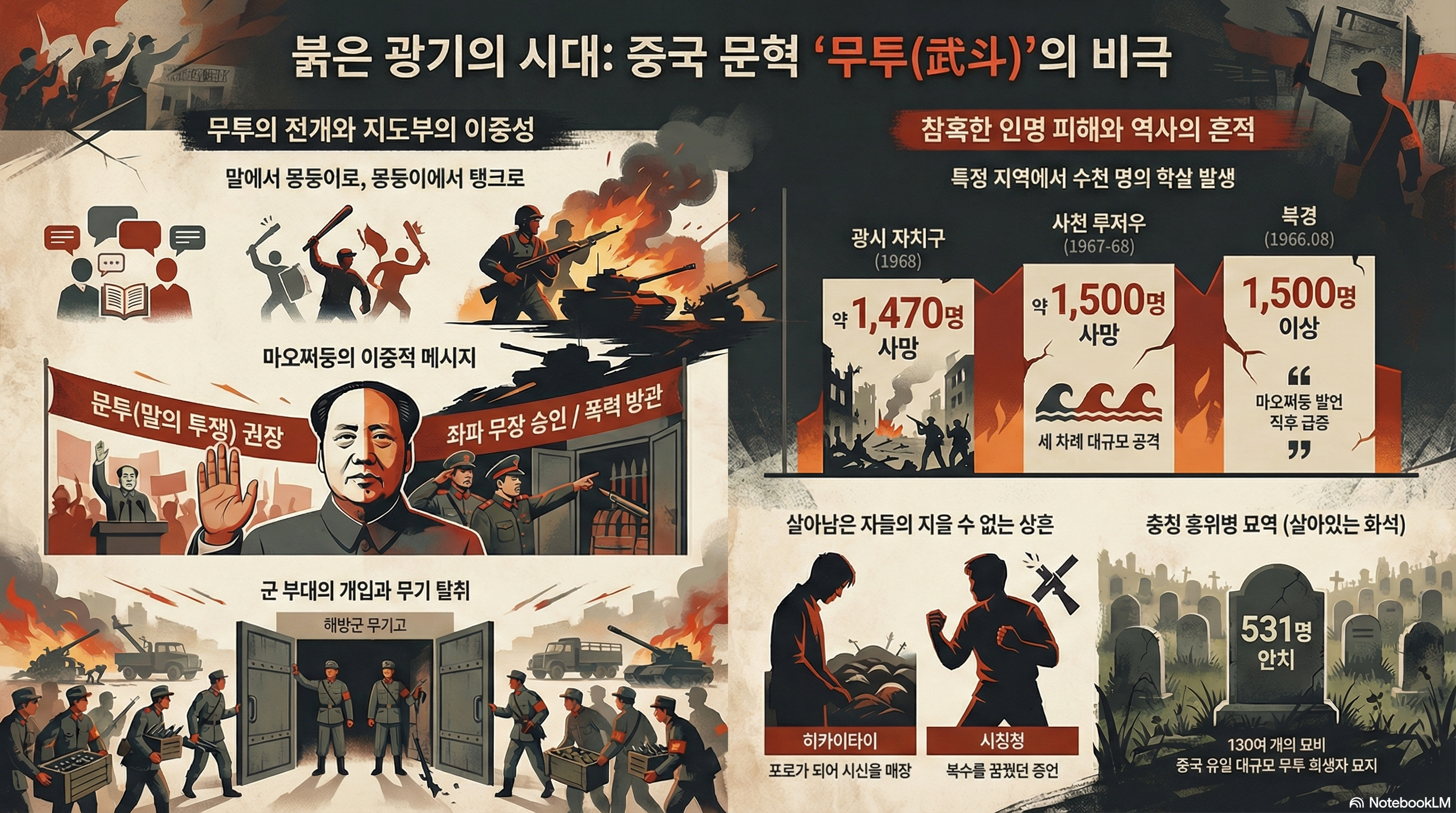 - 마오쩌둥의 ‘4불(四不)’ 정책: 마오쩌둥은 칭화대학교 등에서 벌어지는 참혹한 무투를 보면서도 **"두려워하지 말고, 간섭하지 말고, 서두르지 말고, 압박하지 말라(不怕亂、不管、不急、不壓)"**는 방침을 고수했습니다. 이는 죽음을 향한 ‘계산된 무관심’이었습니다.