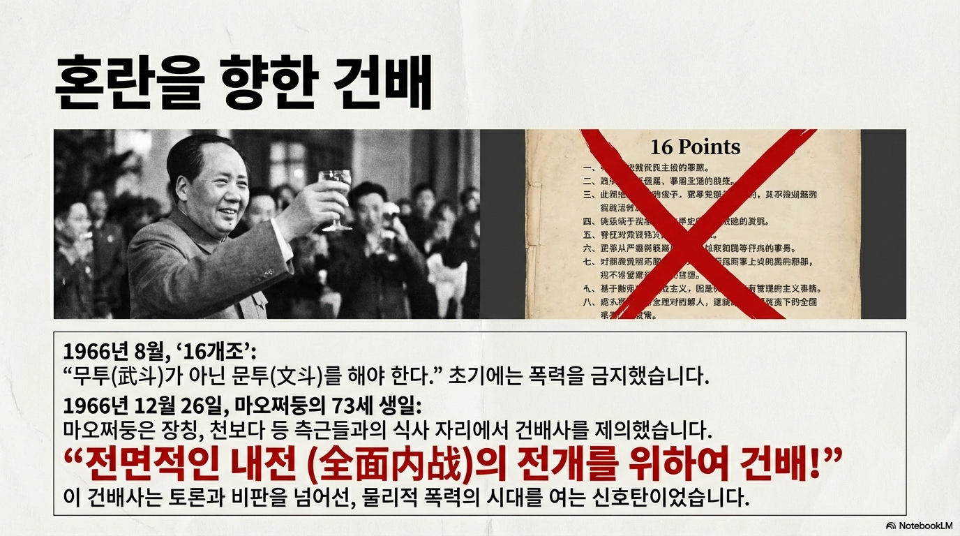 이 비극적 전환의 결정적 시그널은 1966년 12월 26일, 마오쩌둥의 73세 생일 만찬에서 나타났다. 그는 측근들과의 자리에서 “전국적인 전면 내전의 전개를 축하한다”는 건배사를 건넸다. 이는 최고 지도자가 공식 질서의 파괴와 폭력적 충돌을 전략적 수단으로 승인했음을 알리는 변곡점이었으며, 이후 중국 사회는 통제 불능의 광기 속으로 급격히 침몰했다.