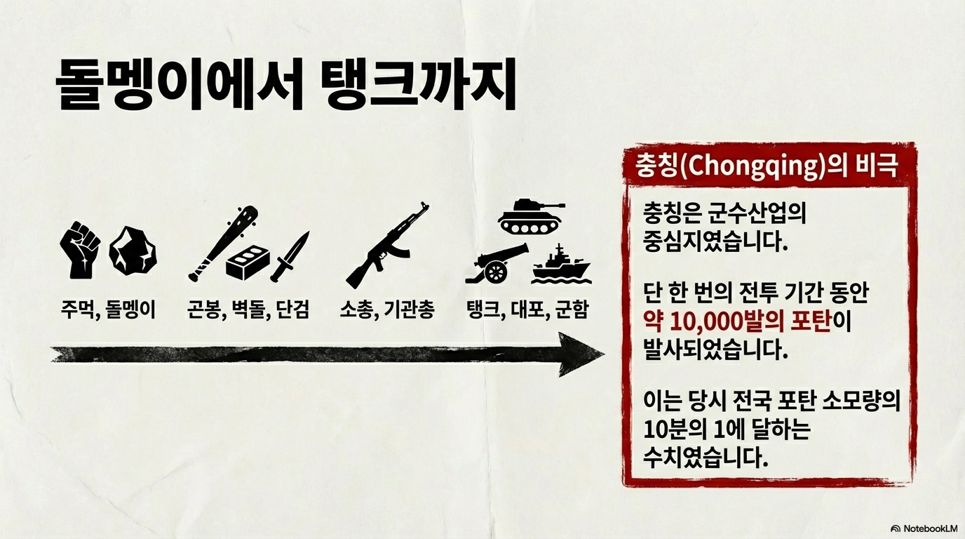 - 압도적인 화력: 기록에 따르면 문화대혁명 기간 전국적으로 소각된 포탄은 무려 96,383발에 달합니다. 중경(충칭) 지역에서만 한 달 사이 1만 발의 포탄이 발사되었으며, 수륙양용 탱크와 고사 기관총까지 동원되었습니다.